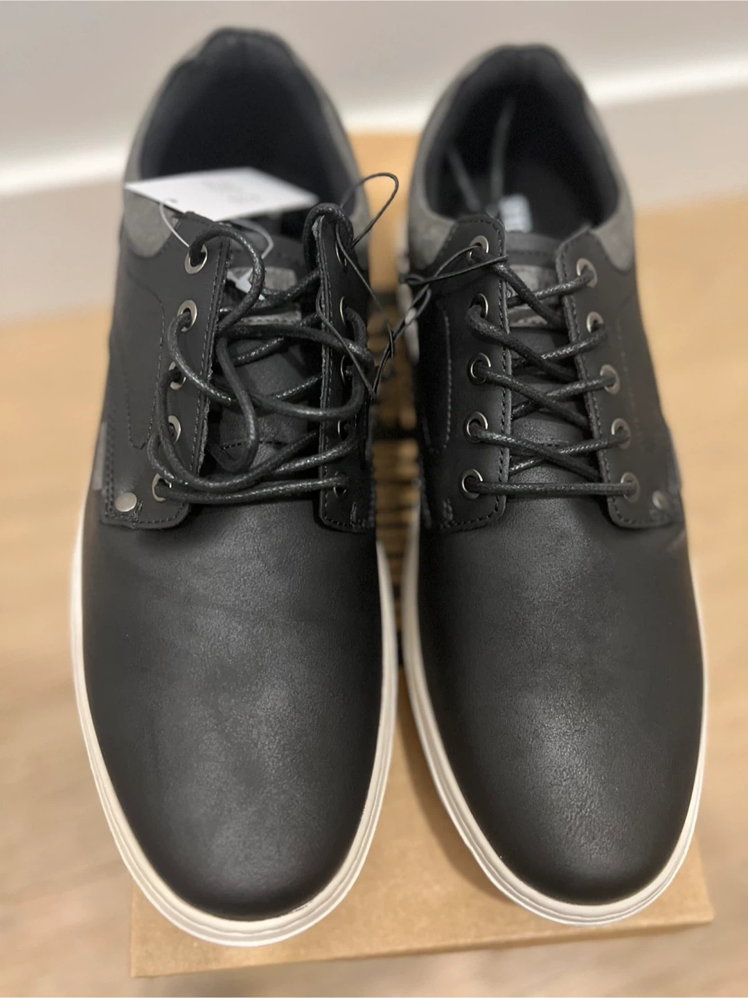 Selling a pair of Steve Madden men's shoes in sizes 8 and 10. They are black leather with a white sole. Comes with the original box!