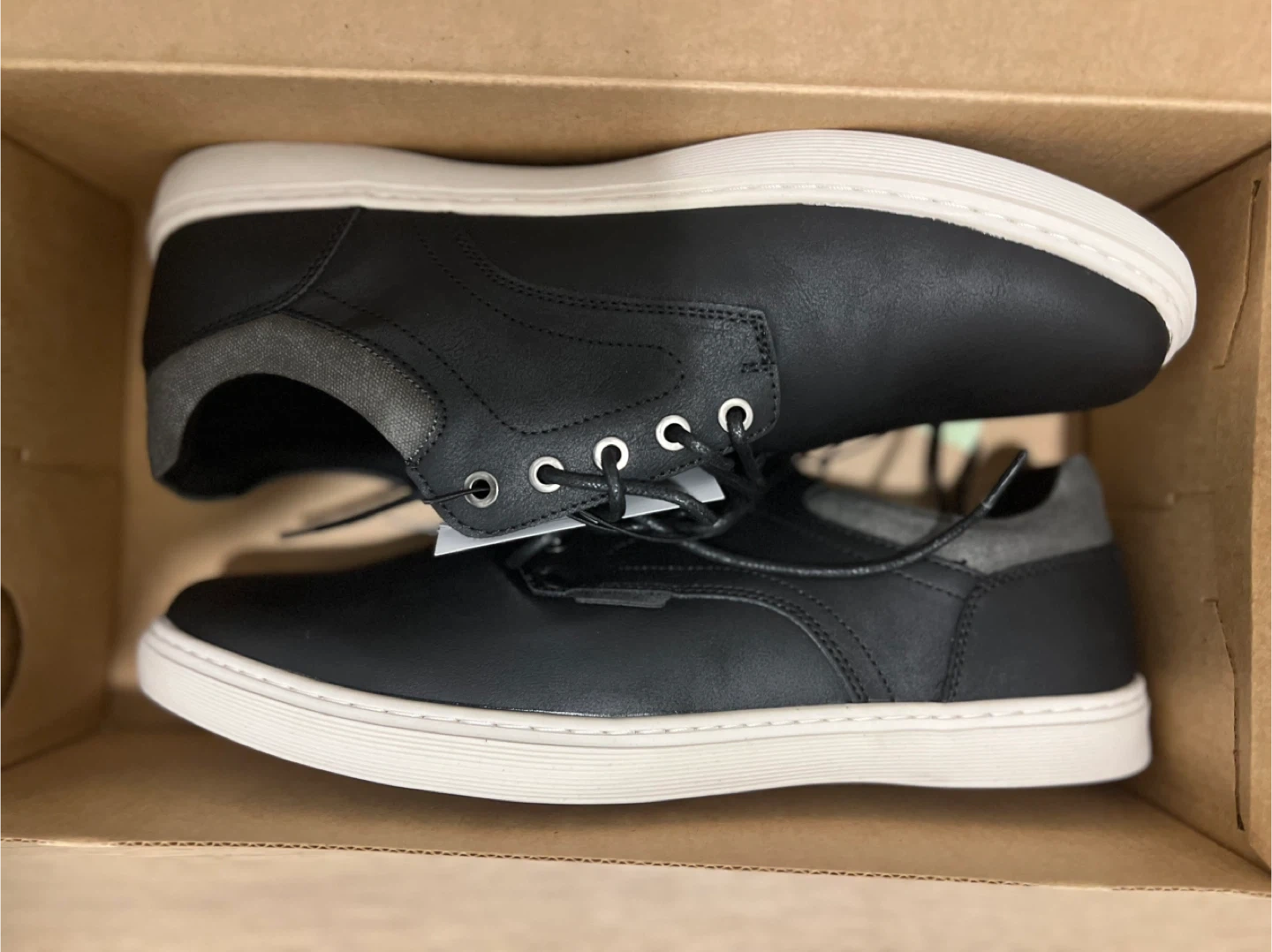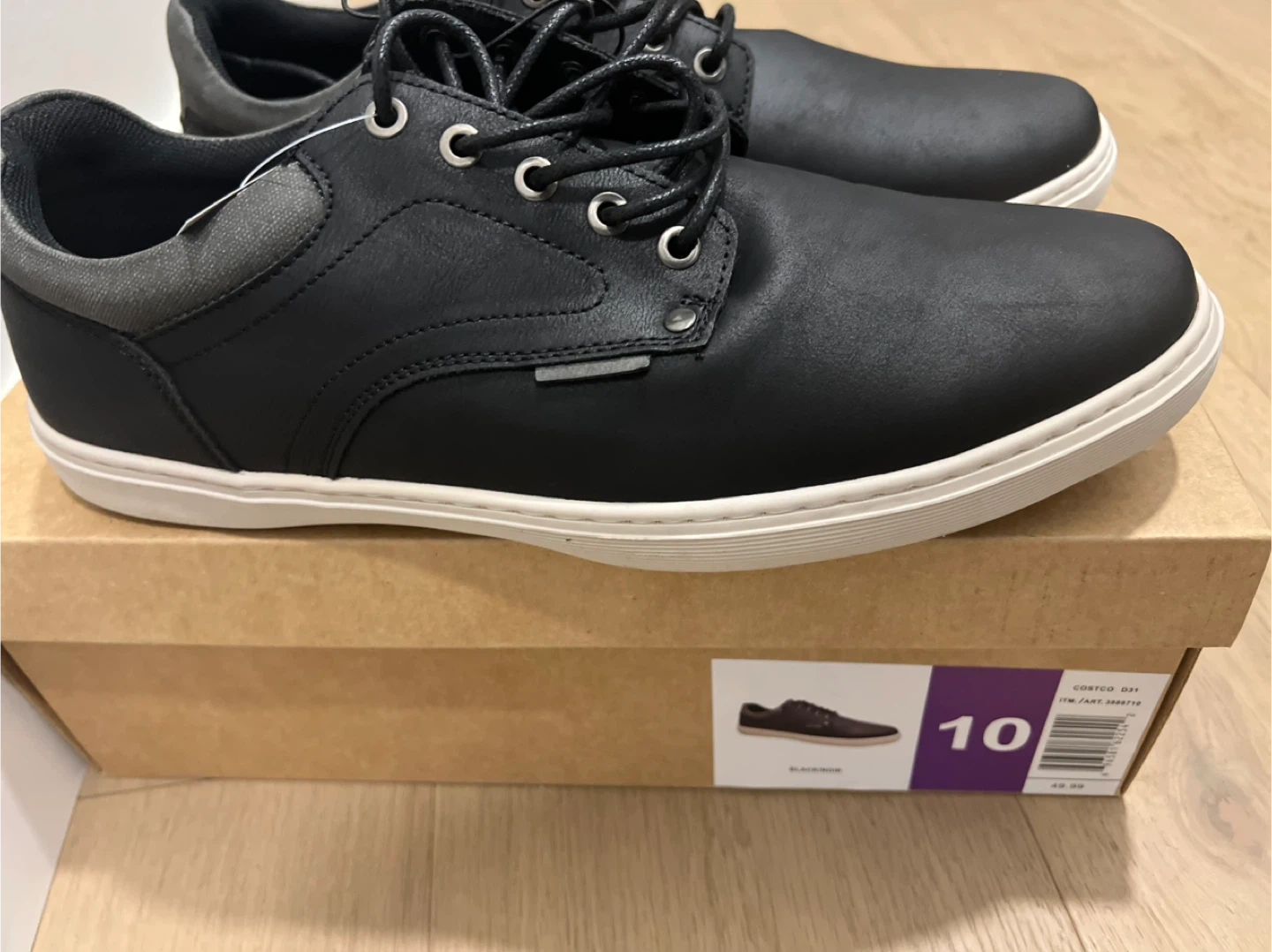 Selling a pair of Steve Madden men's shoes in sizes 8 and 10. They are black leather with a white sole. Comes with the original box!