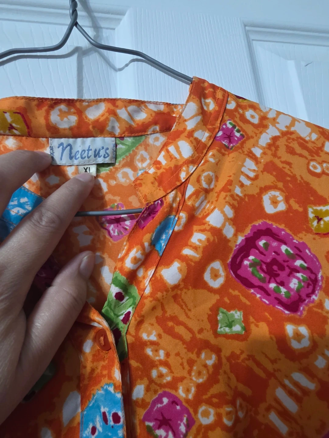 This is a colourful patterned blouse from Neetu's! It's an orange colour and size XL, perfect for adding a pop of colour to your wardrobe