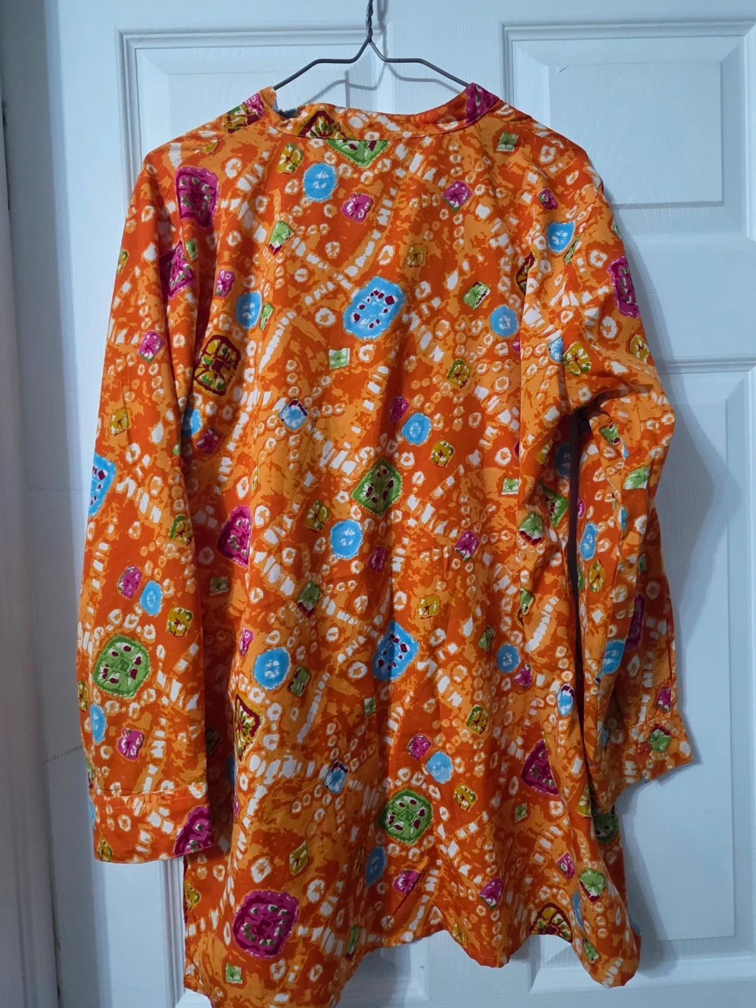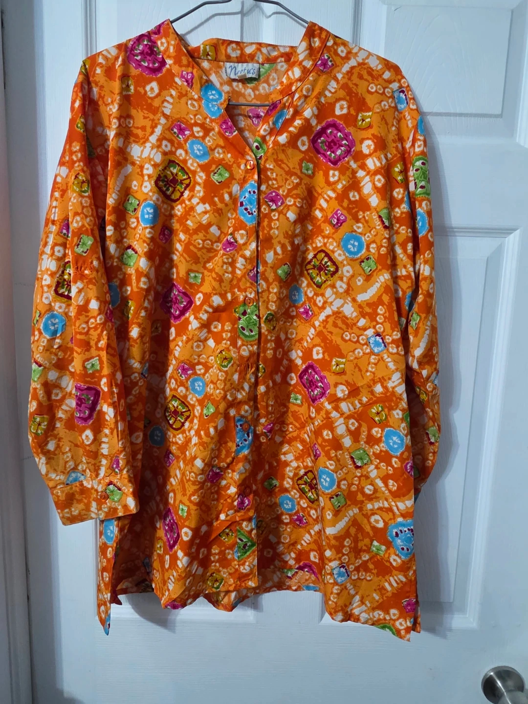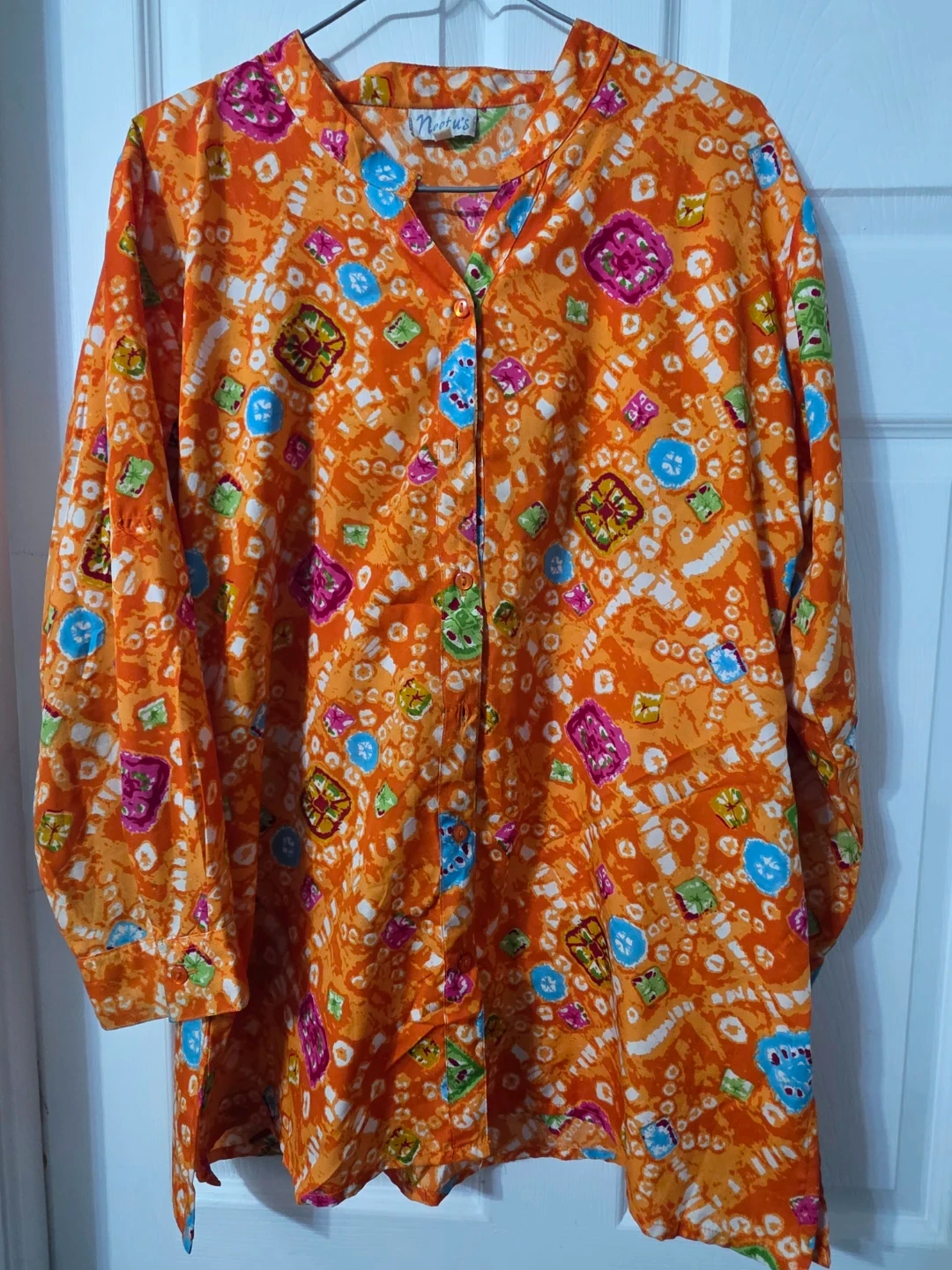 This is a colourful patterned blouse from Neetu's! It's an orange colour and size XL, perfect for adding a pop of colour to your wardrobe