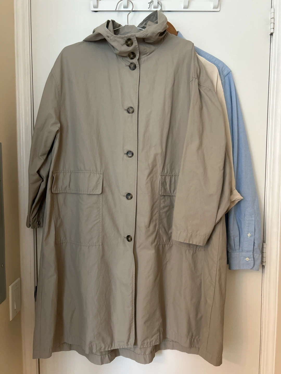 Selling a hooded trench coat.