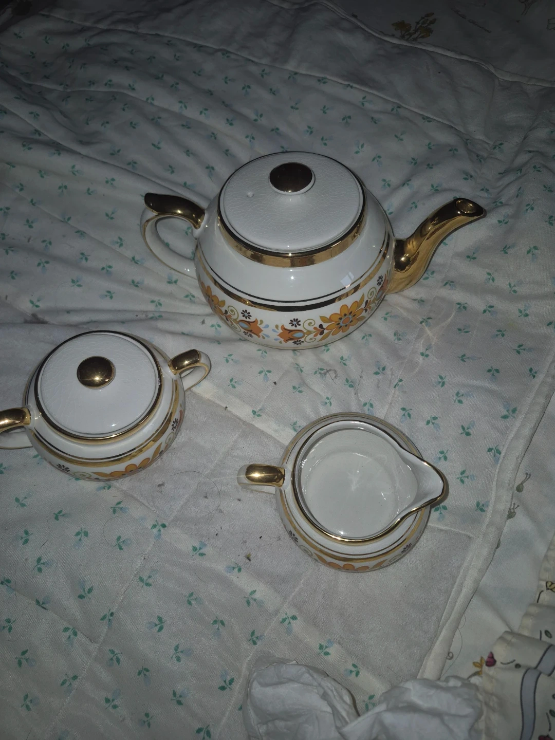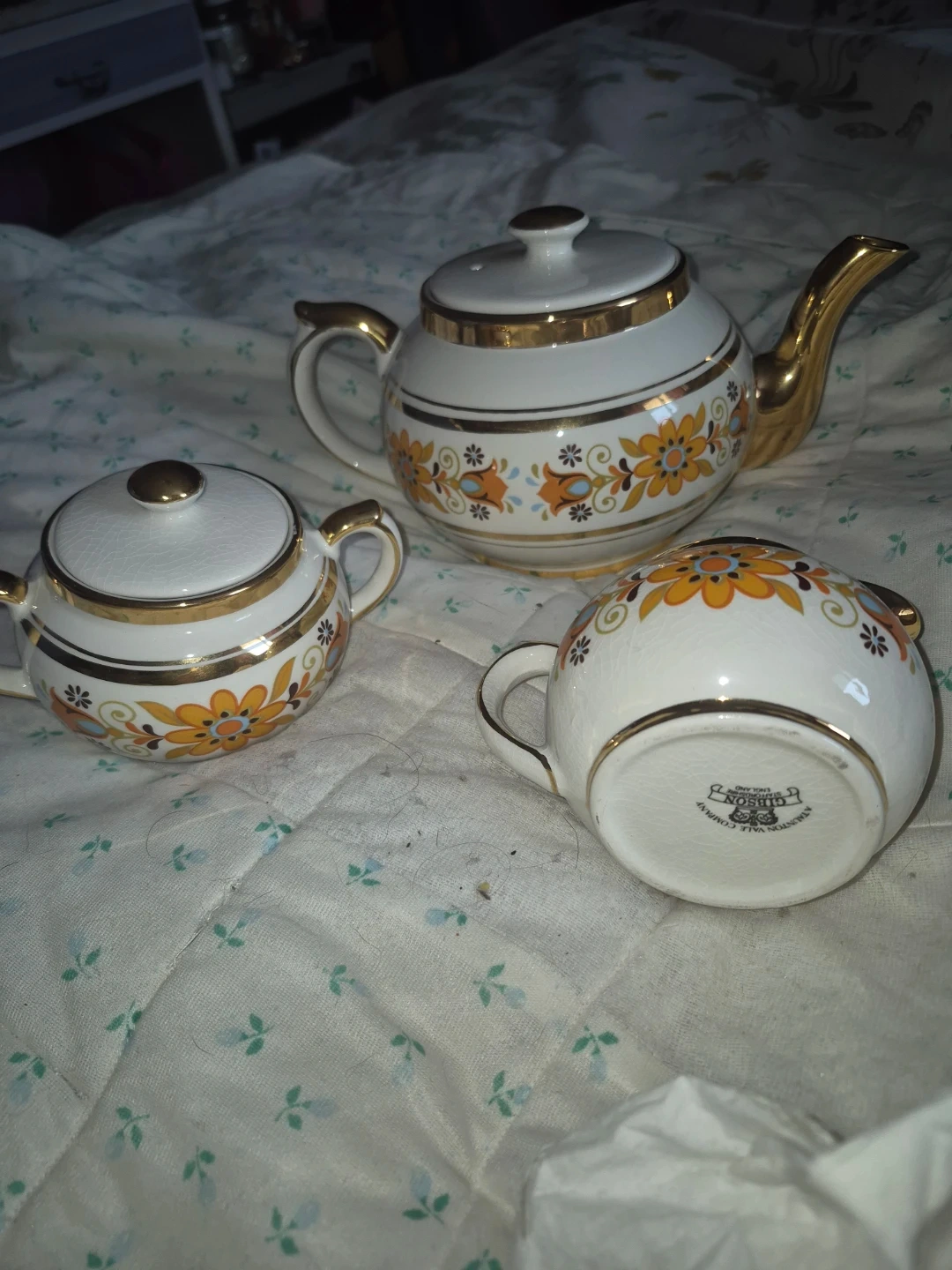 Selling a beautiful Gibson tea set! It includes a teapot, sugar bowl, and creamer. The set features a lovely floral pattern with gold trim. Perfect for afternoon tea or display!