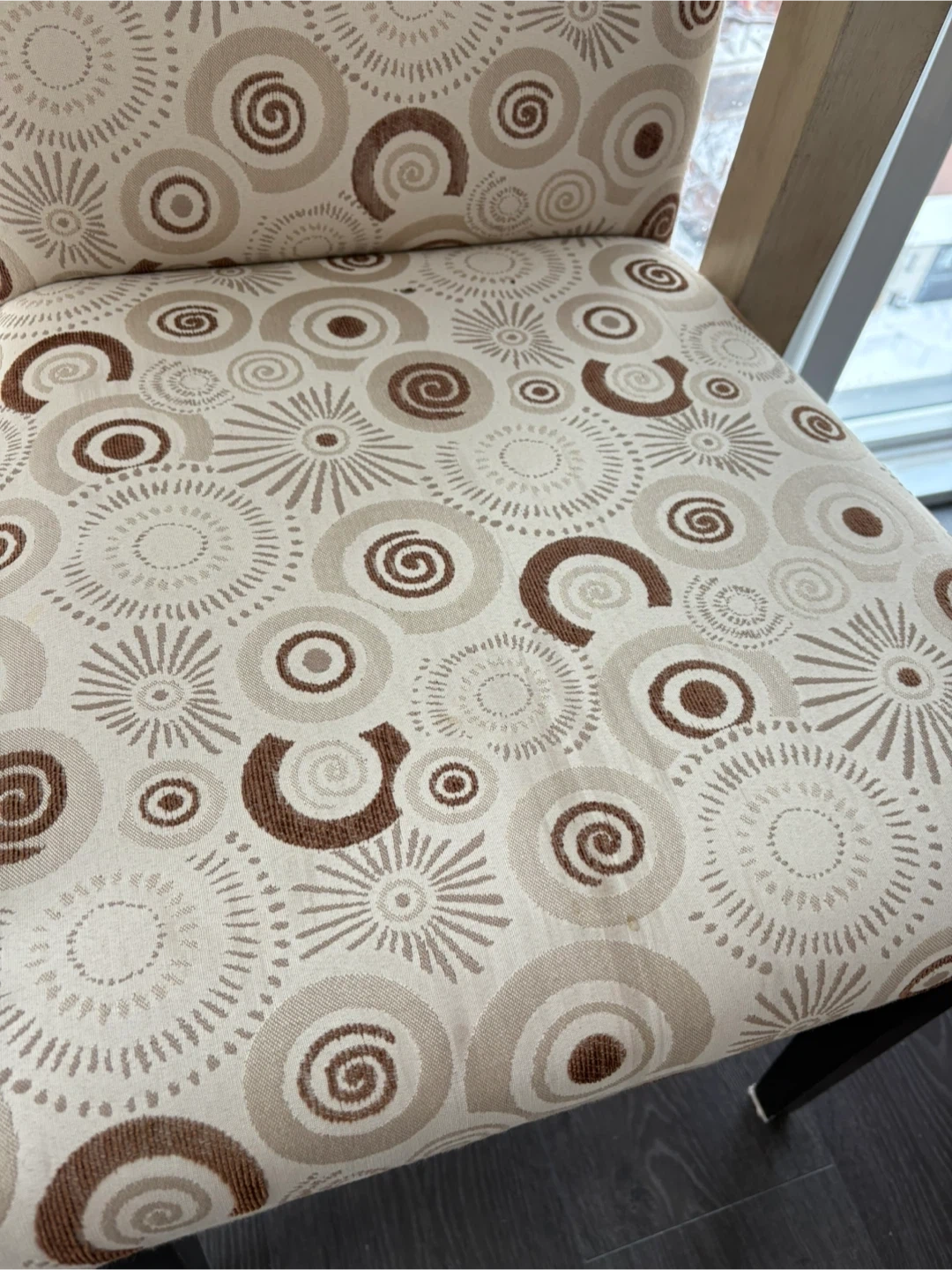 A dining chair with a unique patterned design. Please note that the wooden top part of the back is broken off. I think it can be fixed, but I haven’t looked into it. It’s also functional without that part. Small stain on the seat - see picture.