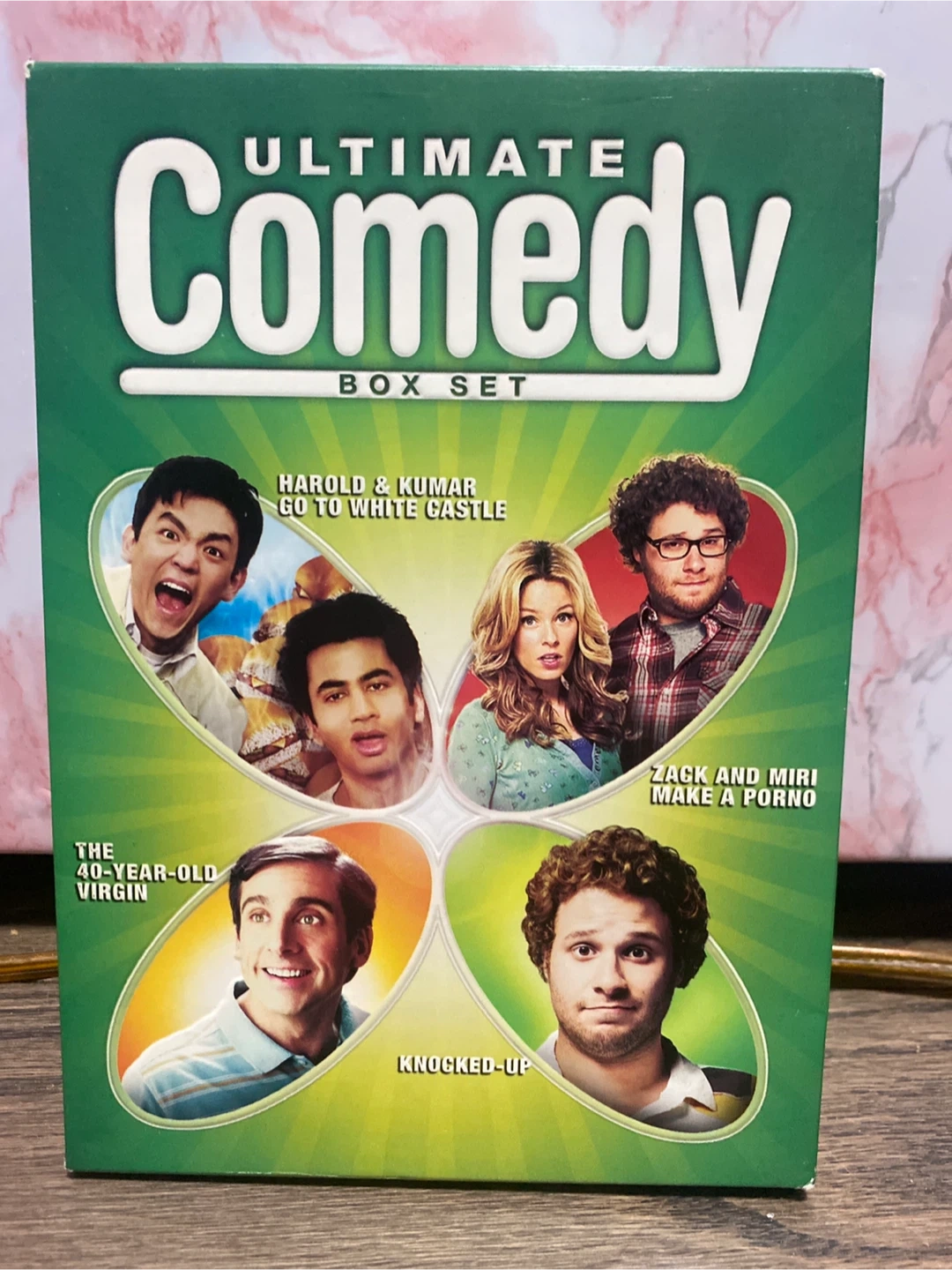 Selling the Ultimate Comedy Box Set, perfect for a movie night with friends! It includes some hilarious movies like Harold & Kumar Go to White Castle, Zack and Miri Make a Porno, The 40-Year-Old Virgin, and Knocked-Up