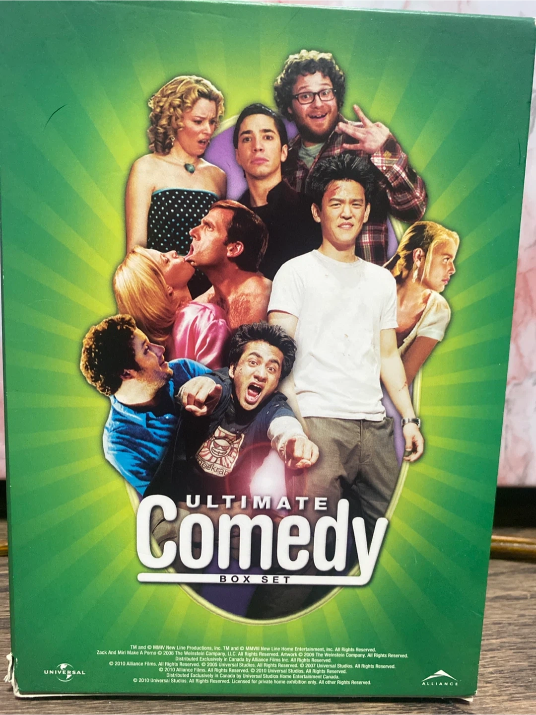 Selling the Ultimate Comedy Box Set, perfect for a movie night with friends! It includes some hilarious movies like Harold & Kumar Go to White Castle, Zack and Miri Make a Porno, The 40-Year-Old Virgin, and Knocked-Up