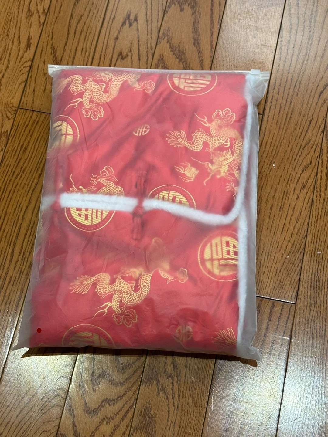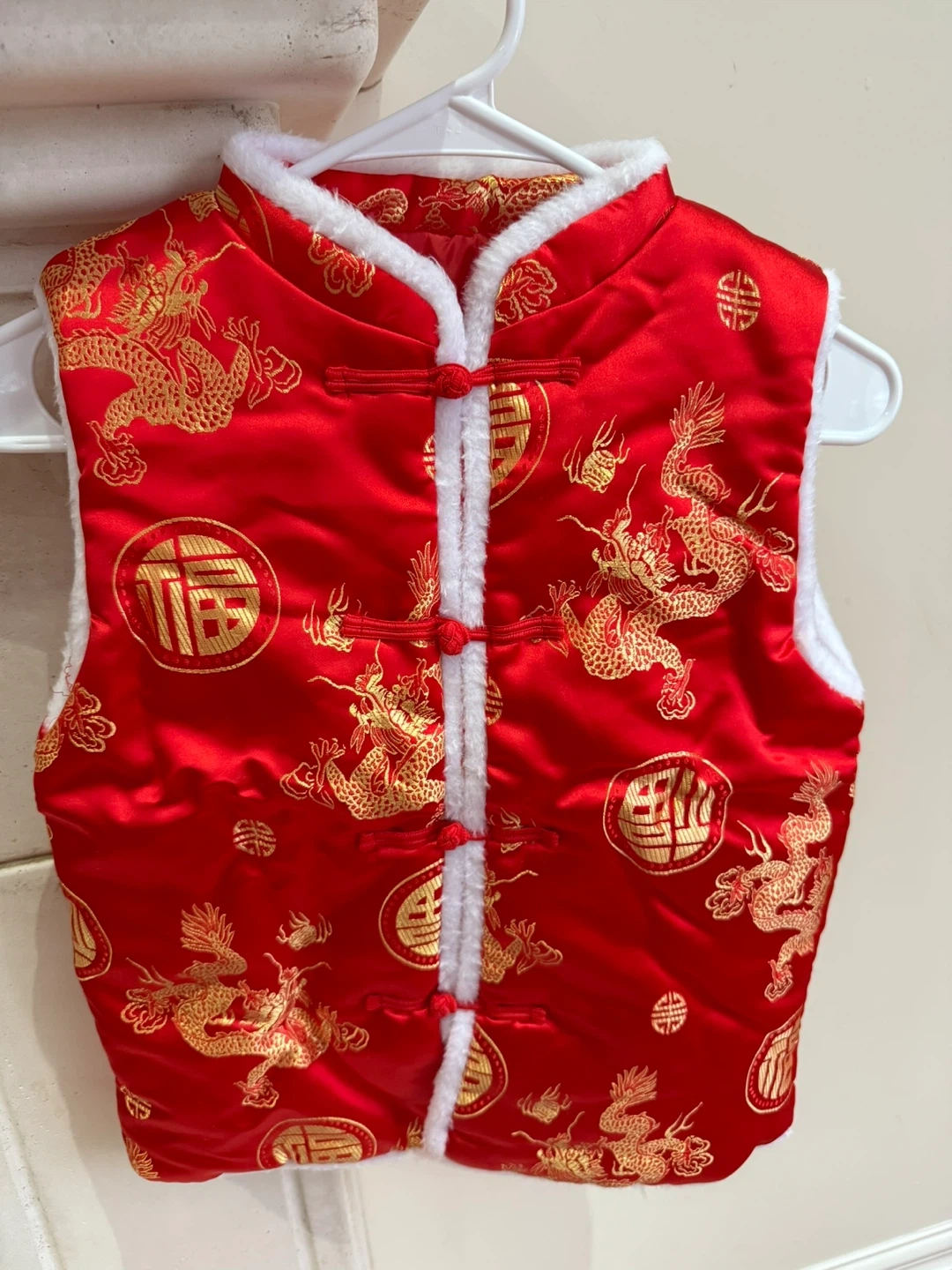 ๐ Design: Red traditional Chinese vest with gold dragon and โFuโ patterns