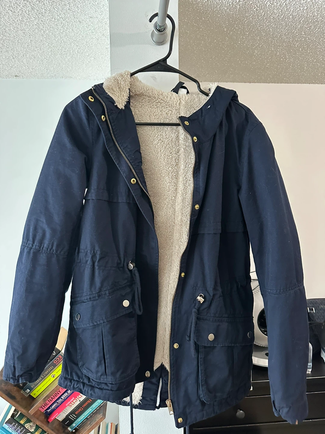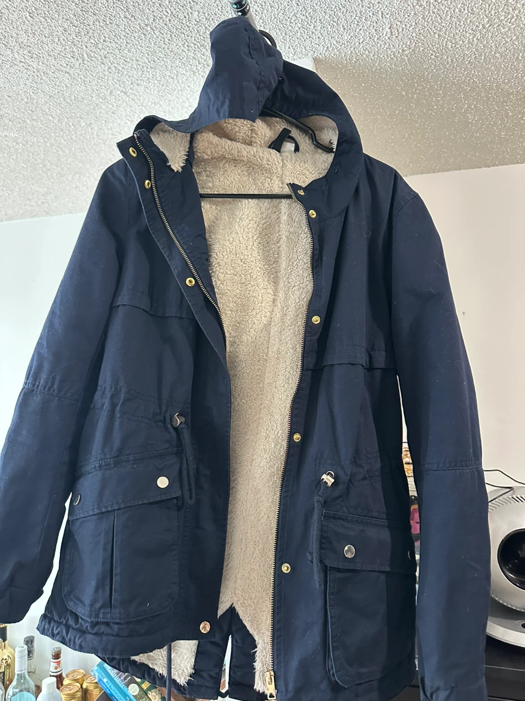 Cozy up in this J.Crew navy blue parka! It features a warm sherpa lining, perfect for chilly Canadian weather. The jacket has a hood and handy pockets, making it both stylish and practical. It's in great condition and ready for a new owner!
