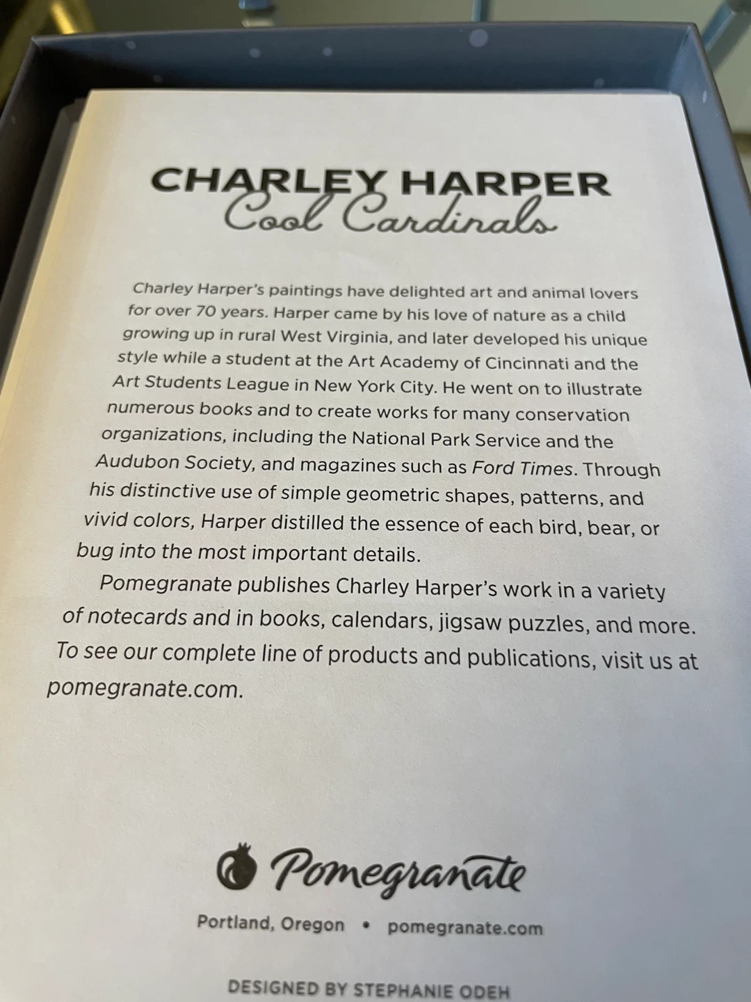 Selling a Charley Harper Cool Cardinals holiday card assortment. The box includes cards with unique designs featuring stylized cardinals and winter scenes. Perfect for sending festive greetings to friends and family for the holiday season.