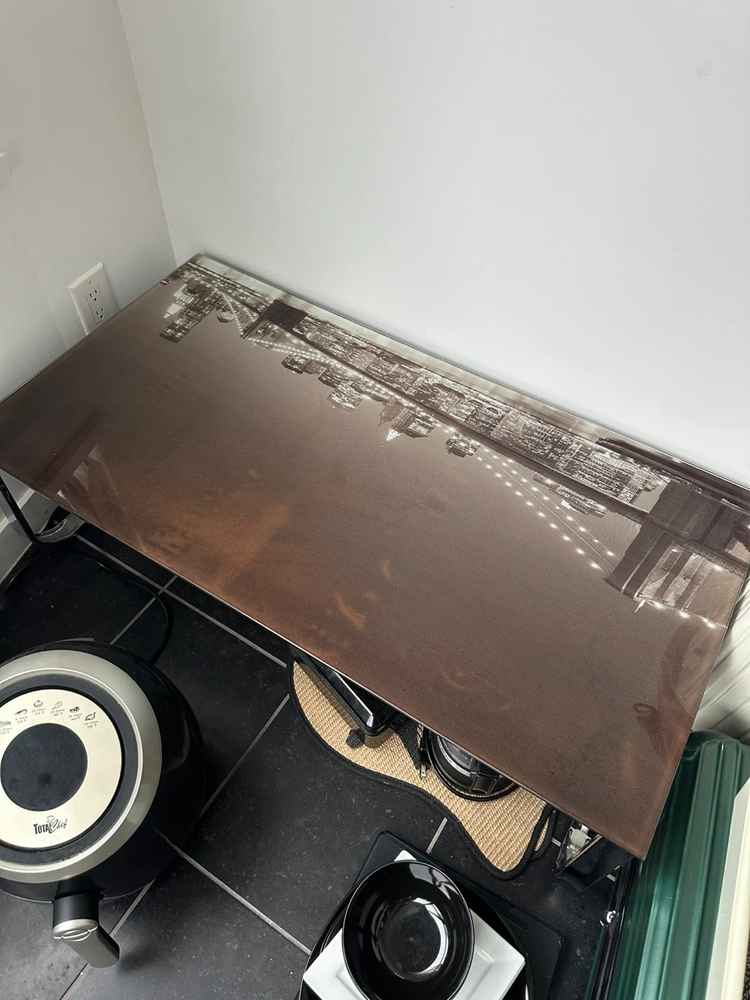 Selling a Lannie glass top coffee table by Ebern Designs. It features a sleek design with a glass top showcasing a city skyline. Originally bought for $149.99. It's in ok condition and ready to brighten up your living room