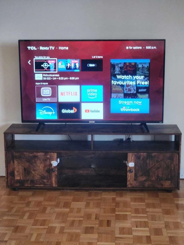 This is a used TV stand with a rustic look, perfect for a living room or entertainment area. The stand is sturdy and provides ample storage with both open shelves and cabinets.