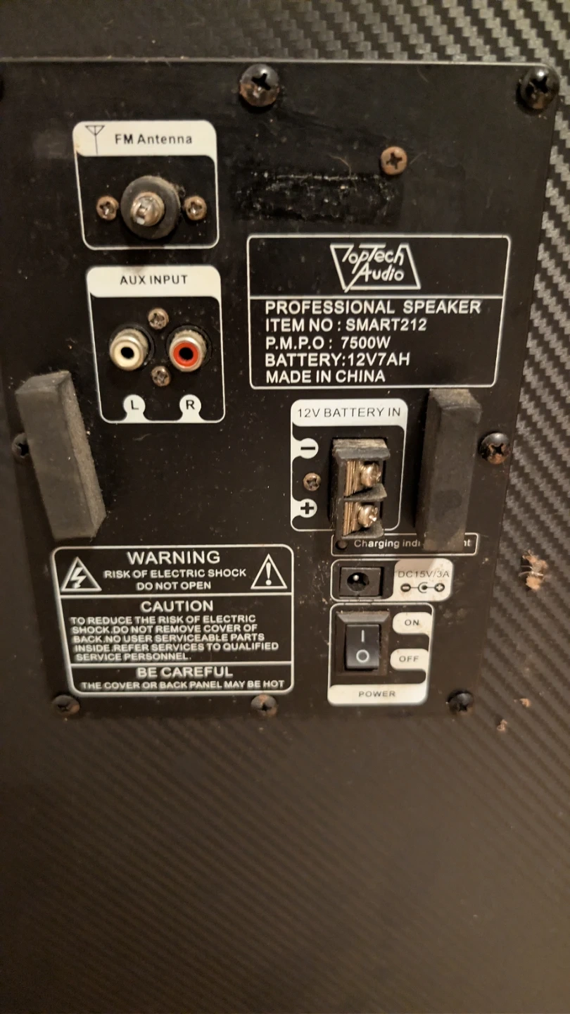 For parts or to fix Selling a Toptech Audio professional speaker, model Smart212. This speaker has a P.M.P.O of 7500W and a 12V7AH battery. It also has an FM antenna and AUX input. Perfect for parties or events!