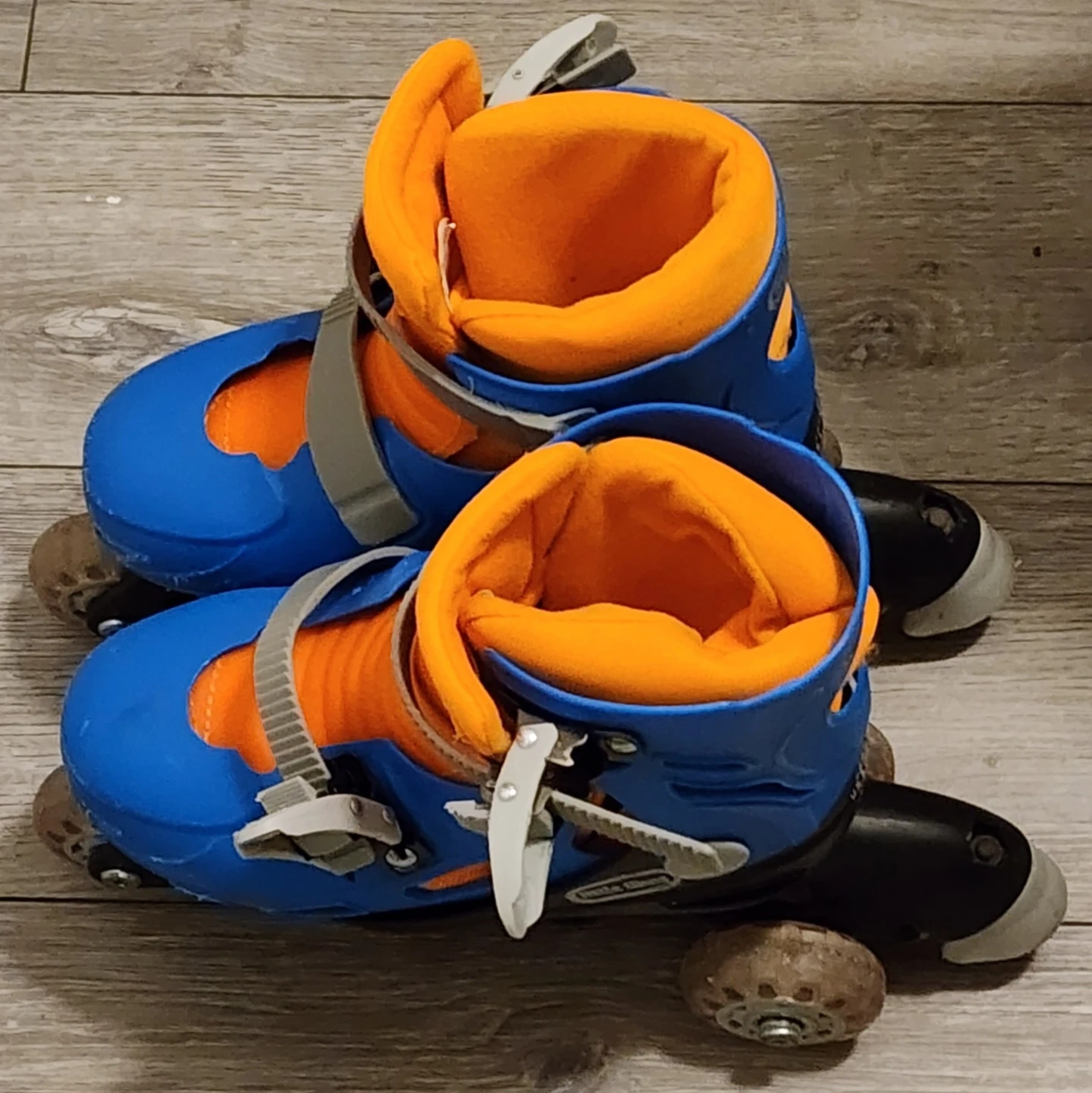 Selling a pair of kids' roller skates, perfect for some outdoor fun! They're blue and orange.