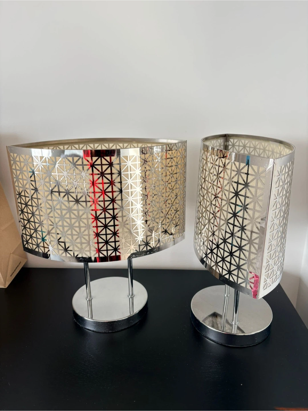 Selling a set of two stylish table lamps! They feature a silver patterned design that would look great in any room. They are in great condition, ready to brighten up your space. Big size Tea candle/light lamp