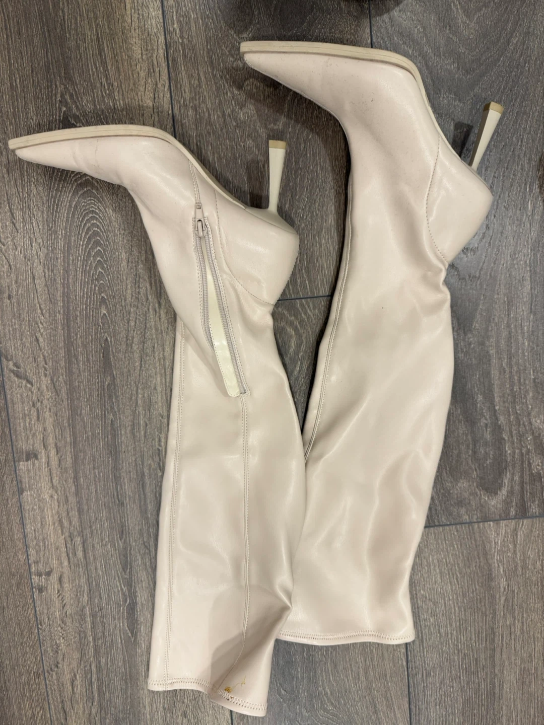 These are a pair of beige knee high heeled boots. They have a pointed toe and a stiletto heel. They are in excellent condition and ready for a new owner. Size 5