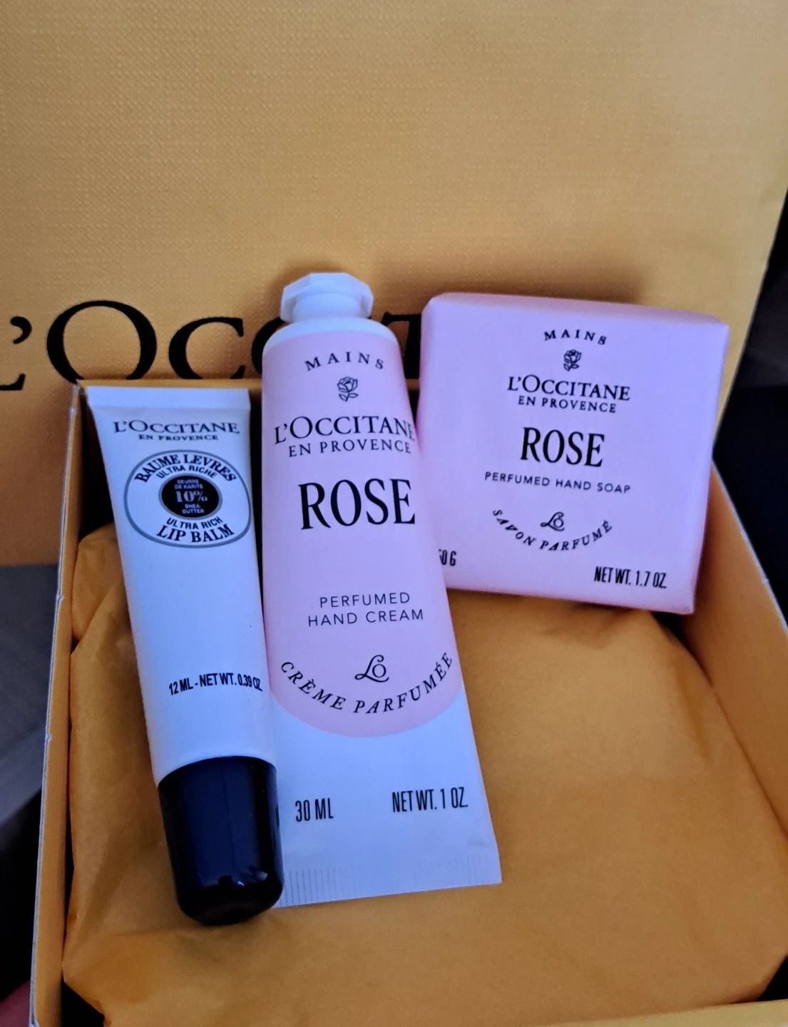 Selling a new L'Occitane care set! It includes a lip balm (12ml), hand cream (30ml), and perfumed hand soap (1.7 oz). Comes with the box and bag