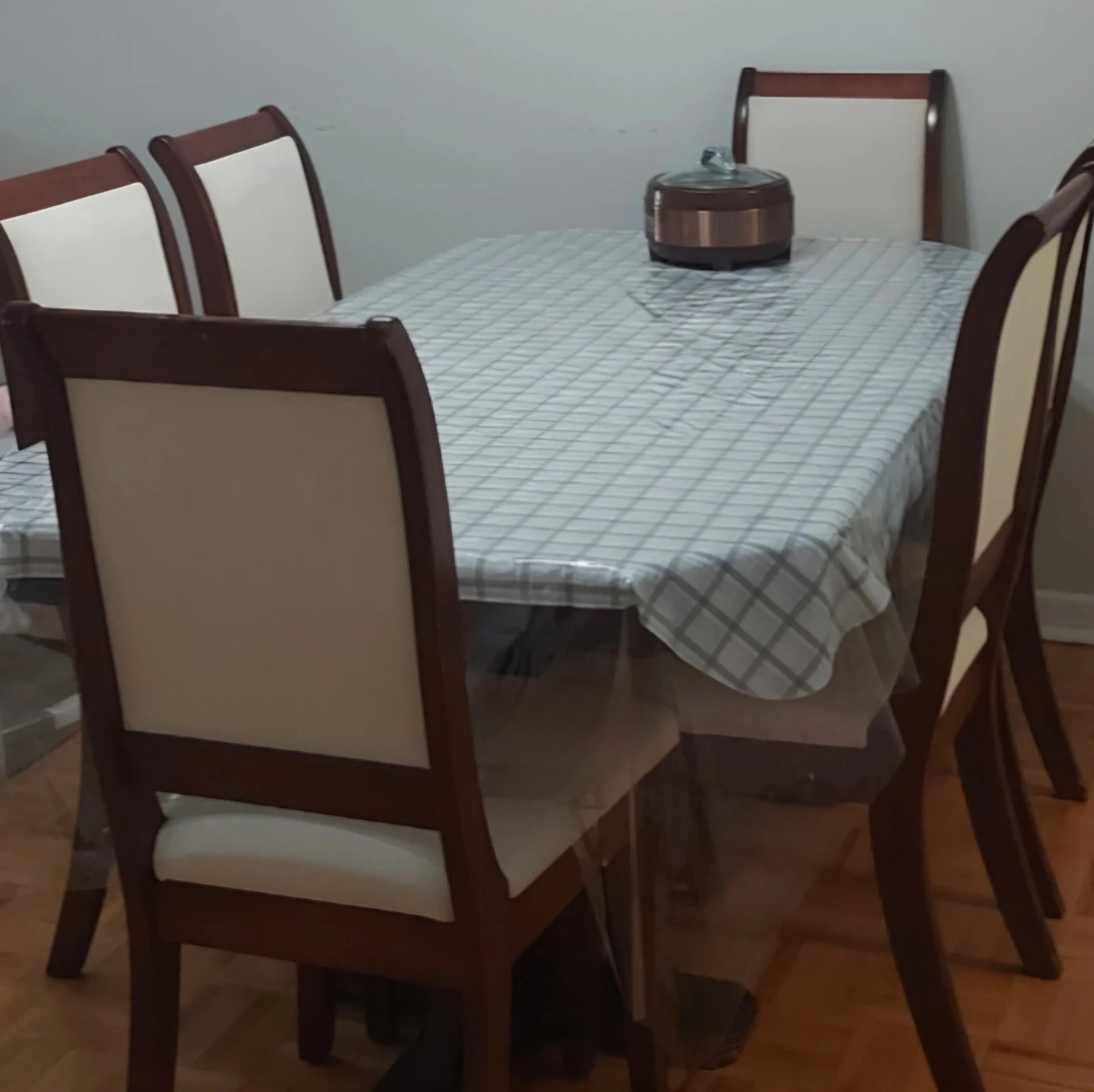 Selling a dining table with 6 chairs. The set appears to be in fair condition and would be great for a dining room. It features a wood frame with light-coloured upholstery on the chairs. Extendable table for 8