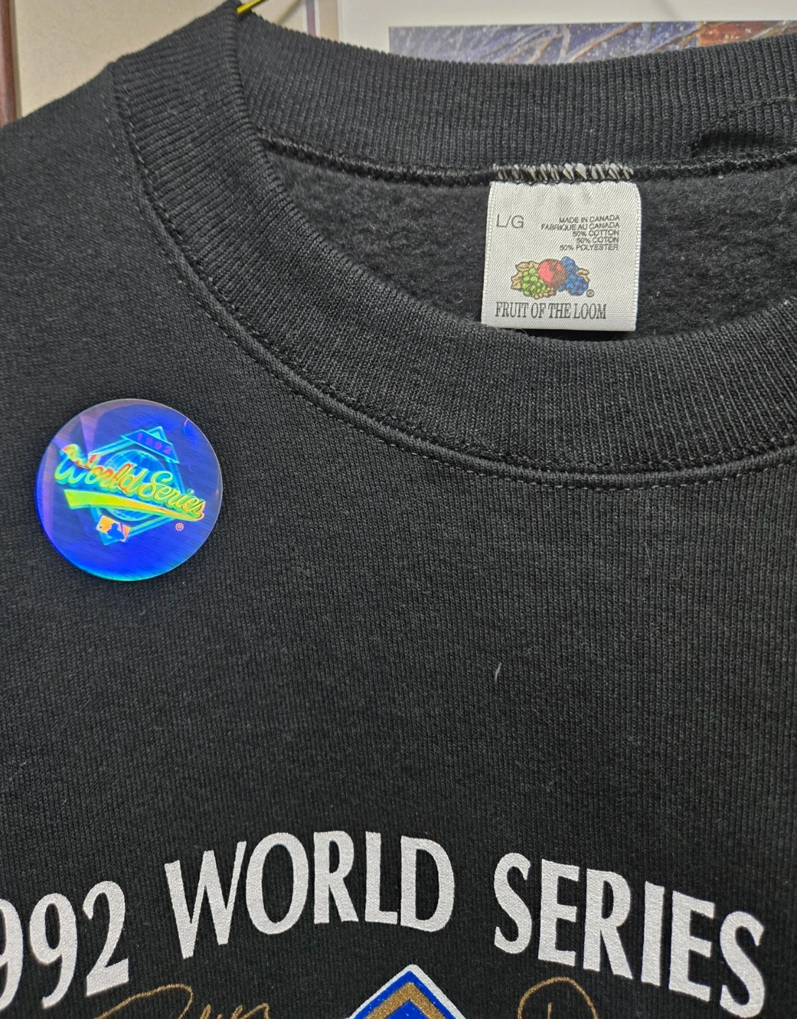 Selling a pair of Toronto Blue Jays 1992 World Series Championship sweatshirts. Like New, never worn. They still have the World Series halogram Tags attached. The Black Sweatshirt with the signatures is a Large Fruit of the Loom