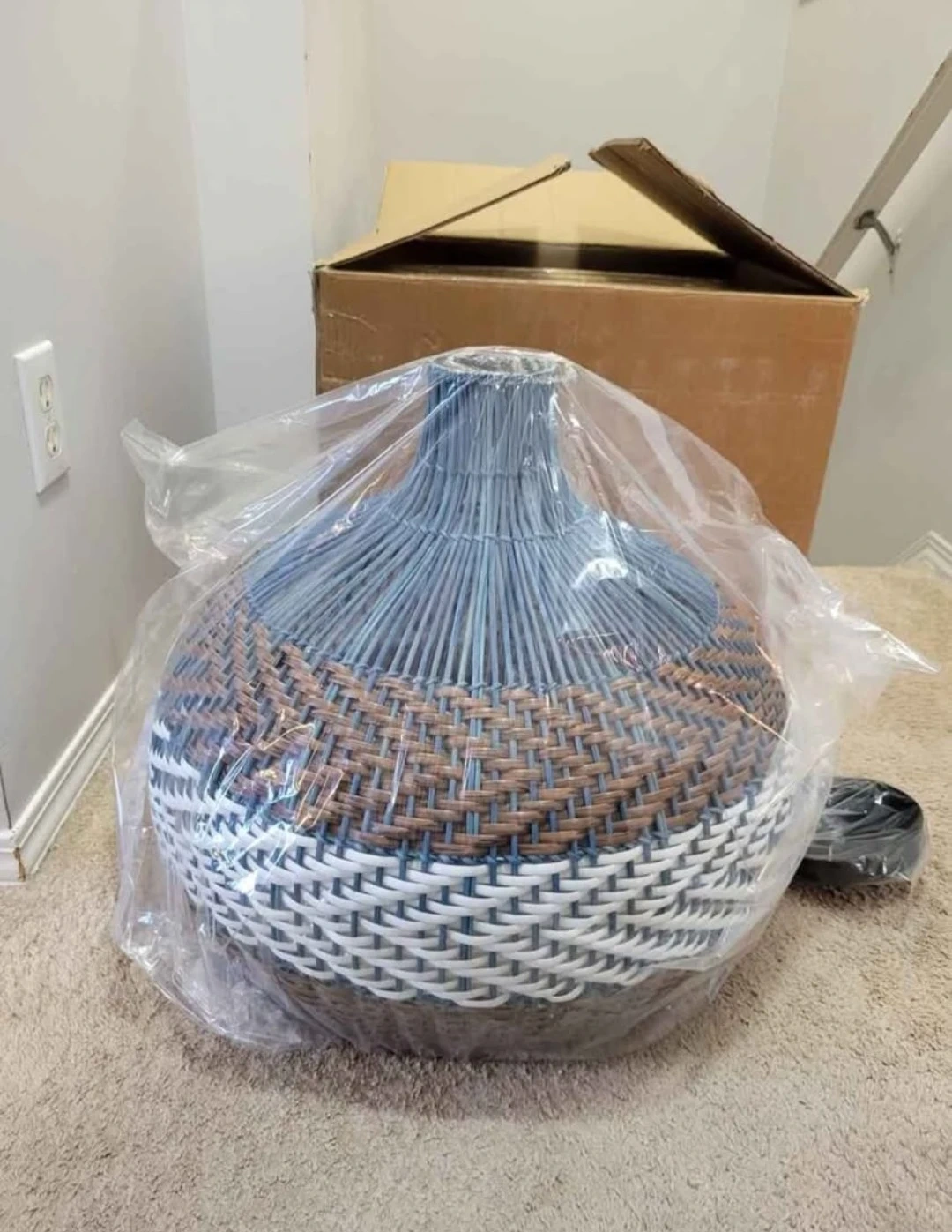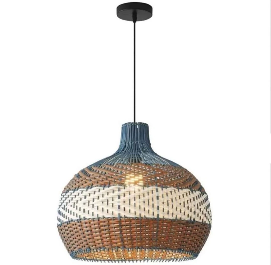 The Arturesthome Creative Blue Rattan Pendant Light is a handwoven wicker chandelier designed for hanging ceilings, ideal for kitchen islands and other living spaces. It measures approximately 19.7" x 17.71" and features a natural, artistic rattan construction with a vibrant blue color, providing a warm, bohemian aesthetic.