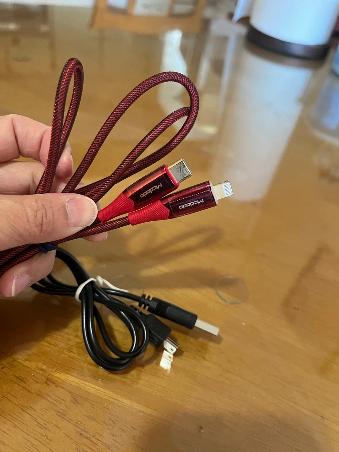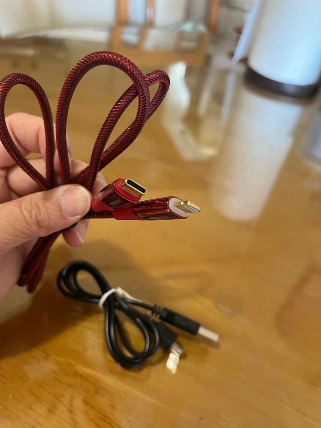 There's a red braided cable with both a USB-C and Lightning connector