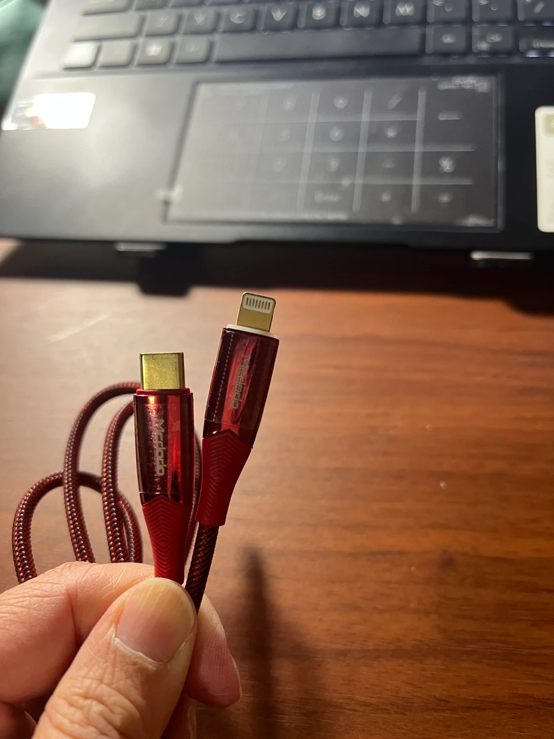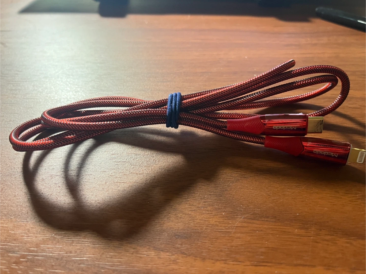 There's a red braided cable with both a USB-C and Lightning connector
