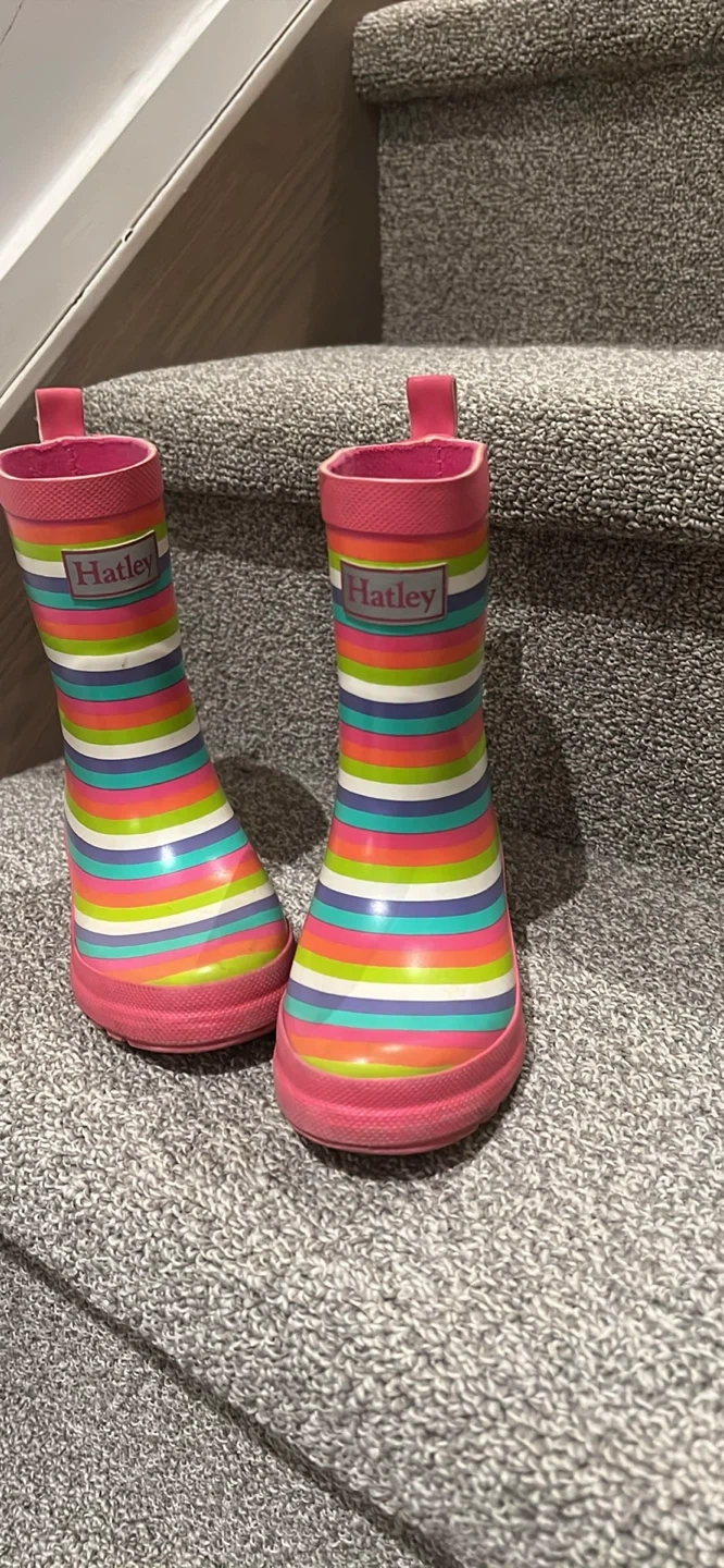 These Hatley kids' rain boots are super cute with their colourful striped design! They're in great condition and ready for some puddle-jumping fun. Size is 9 toddler.