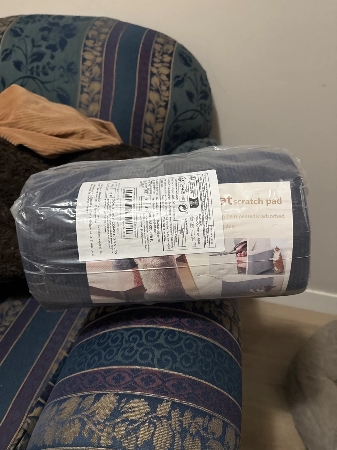 Selling a brand new cat scratch pad, still in its original packaging! It's designed to be repeatedly adsorbed and can be used on a table. Made with 100% polyester fibre.