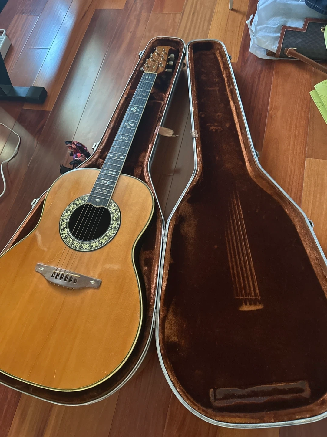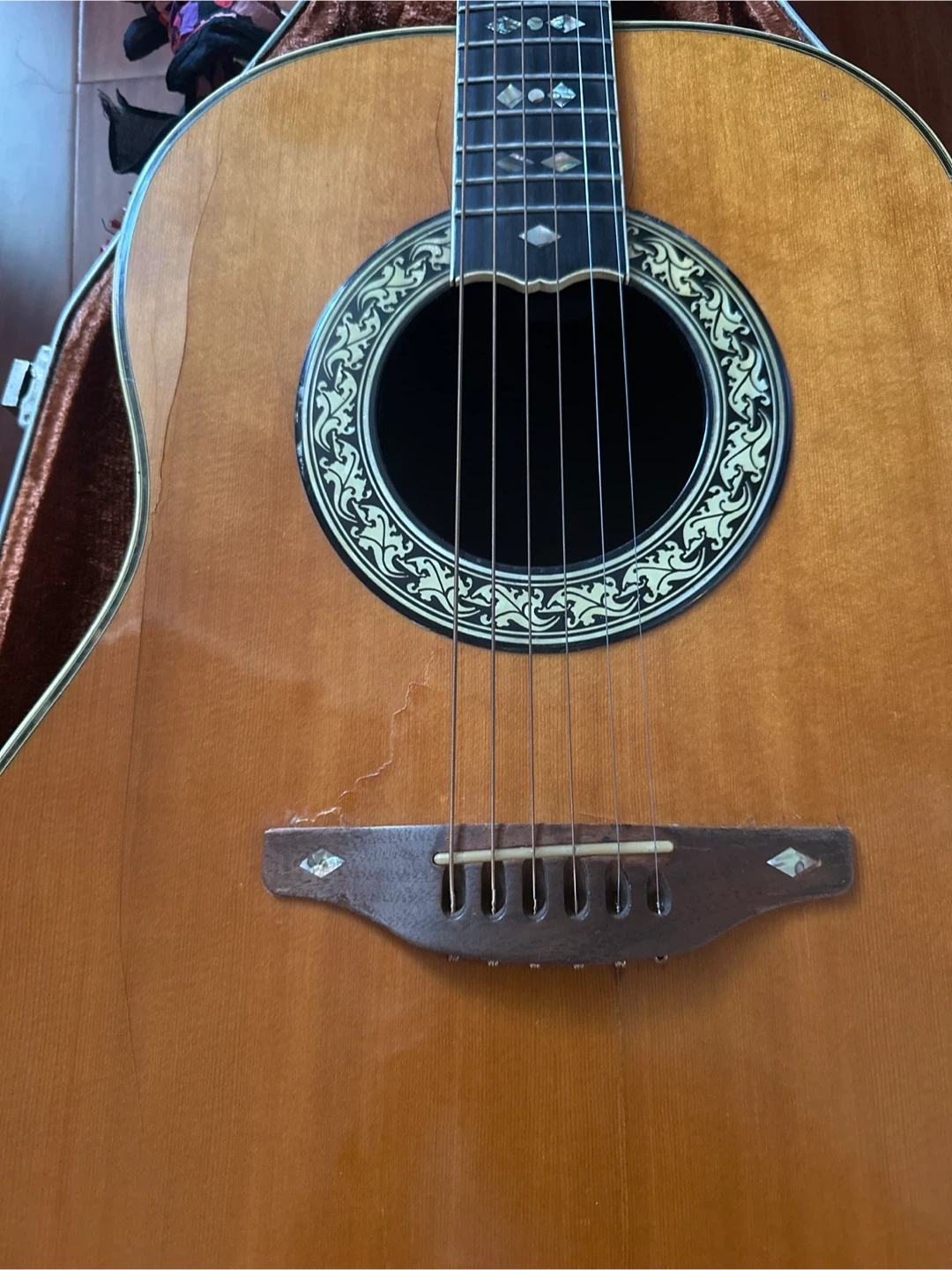 Selling an Ovation acoustic guitar that's in fair condition! It comes with its original hard case. The guitar has a beautiful wood finish and a unique sound hole design but it has seen its better days. If you're a collector, if you want to fix this baby up to give it 2nd life, this one may be yours.