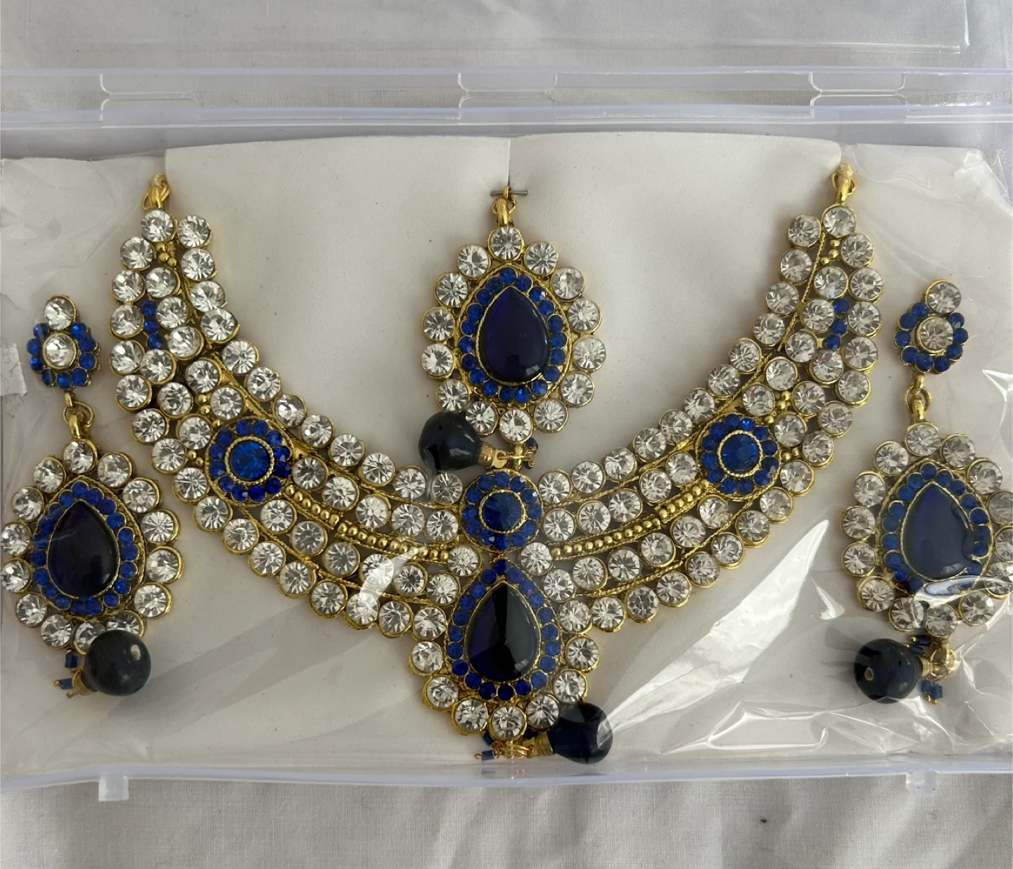 Beautiful jewellery set with a necklace and matching earrings and a matching head piece! The set features blue and white stones set in a gold-tone metal. Perfect for adding a touch of sparkle to any outfit