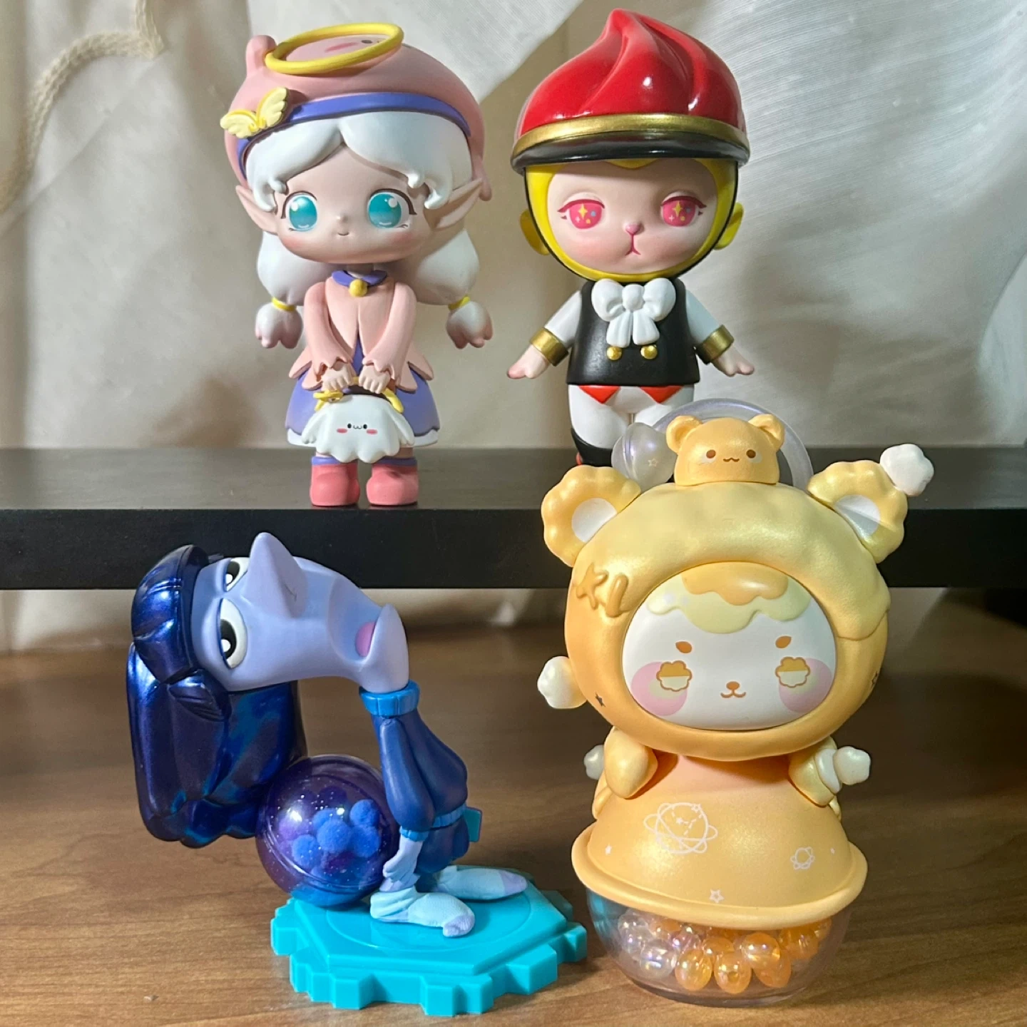 Mix of blind box character figurines including Ennui, Saturn Bear from Lucky Mix, Monkey from Popmart x Bunny, and Angel from Jova. Comes with character cards.