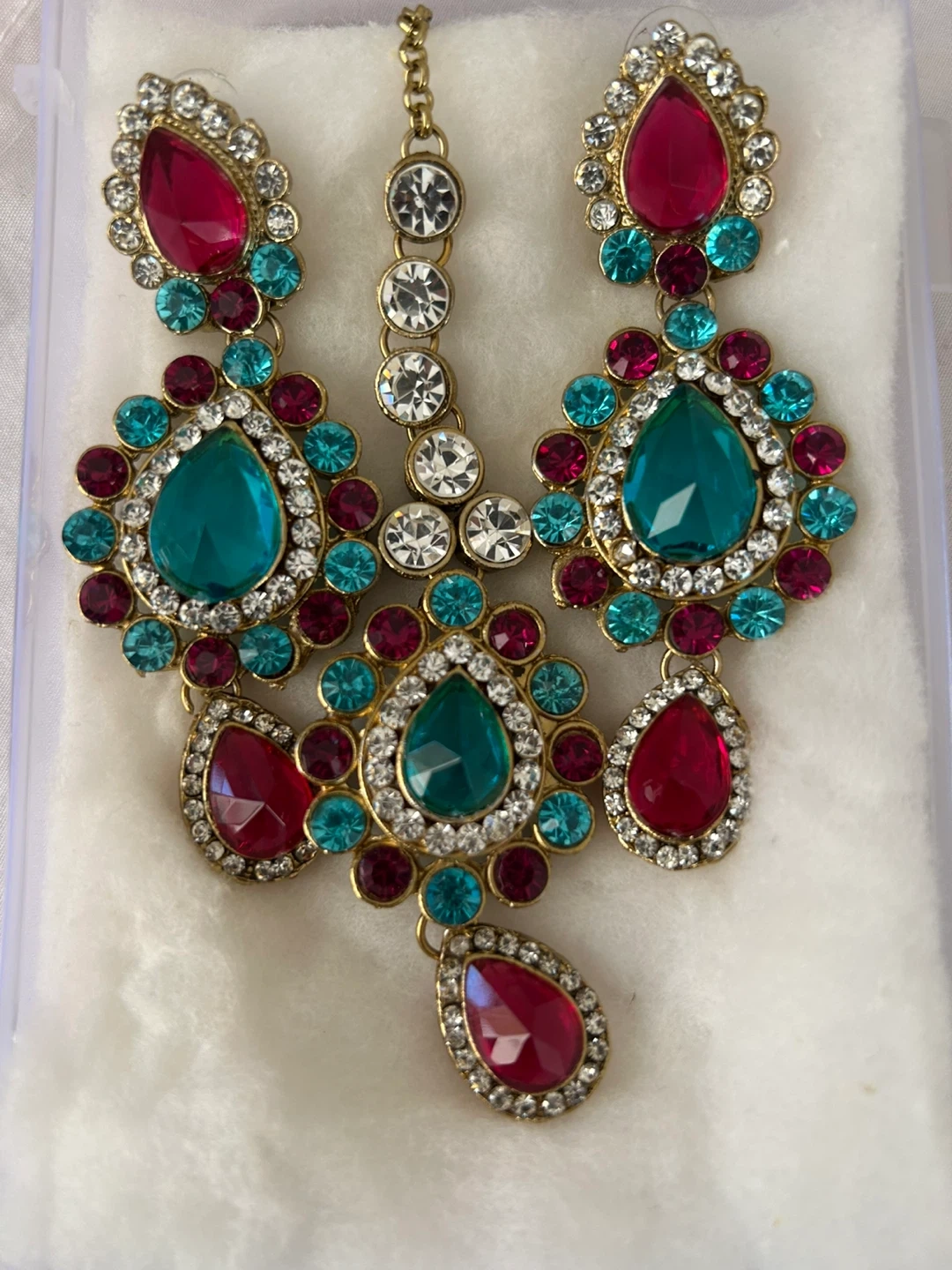 Beautiful Indian Tikka headpiece with gold detailing and pink, teal and clear stones! Perfect for adding a touch of elegance to any outfit or special occasion. In great condition!