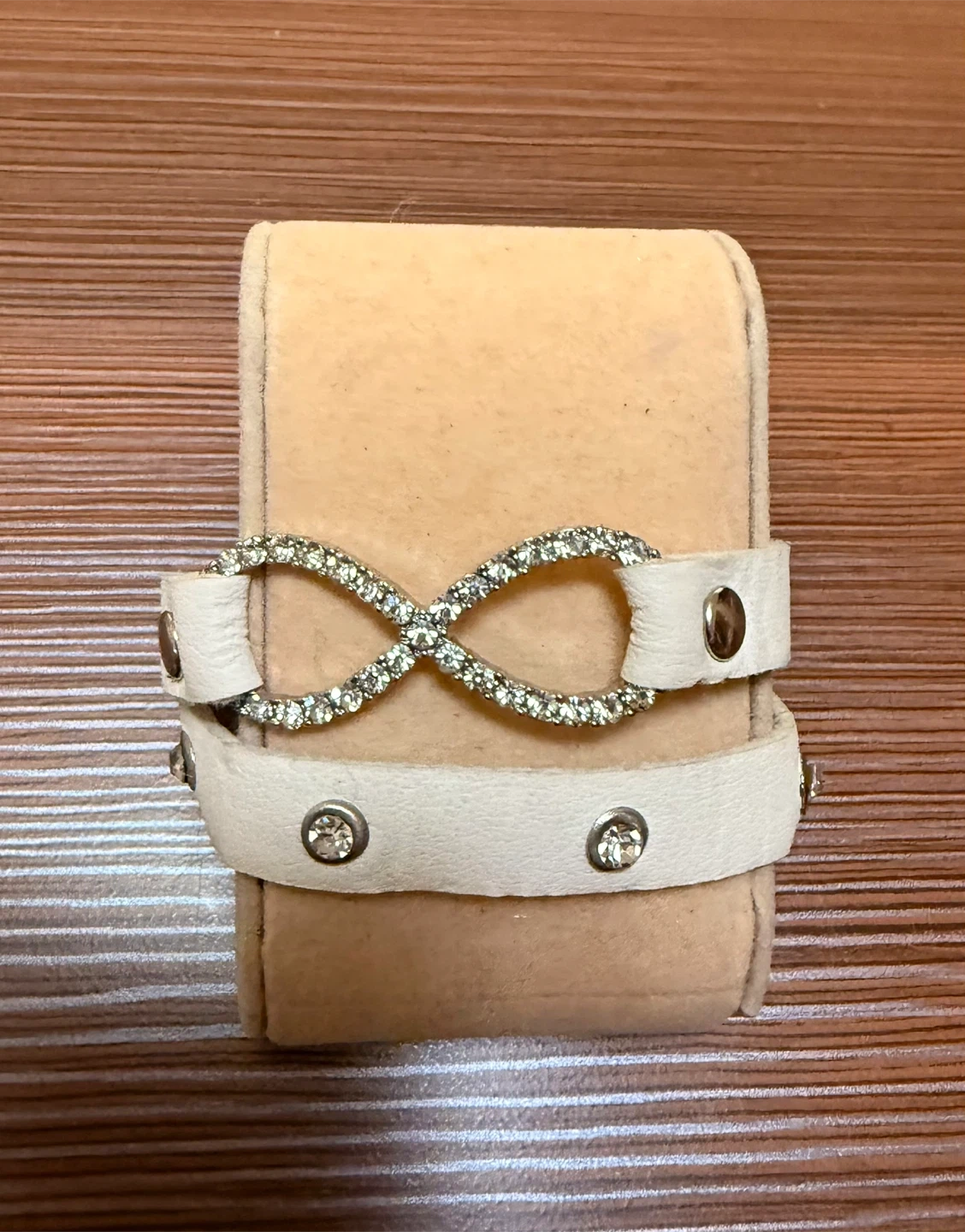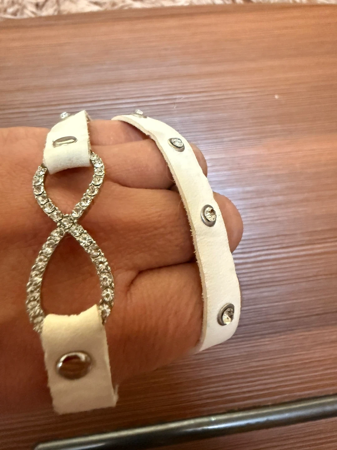 A cute white bracelet with stone detailing! It has a unique infinity symbol design in the center and small stones along the band. Perfect for adding a touch of sparkle to any outfit