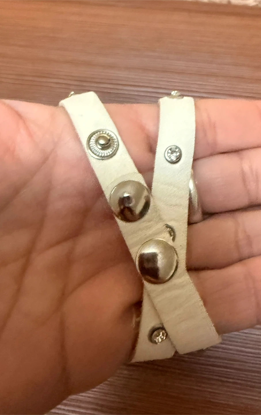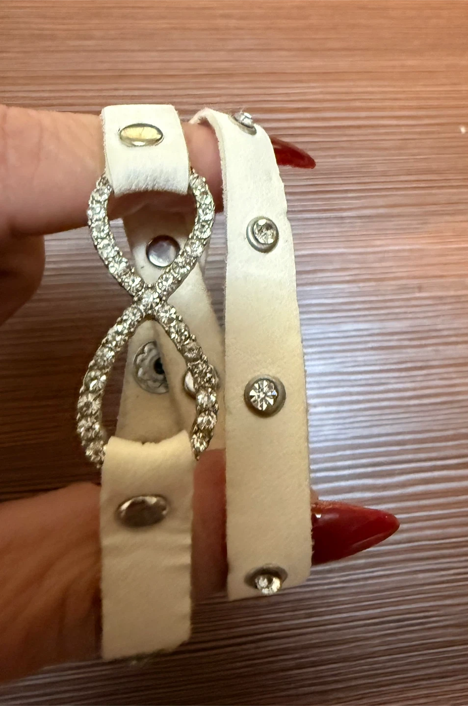 A cute white bracelet with stone detailing! It has a unique infinity symbol design in the center and small stones along the band. Perfect for adding a touch of sparkle to any outfit