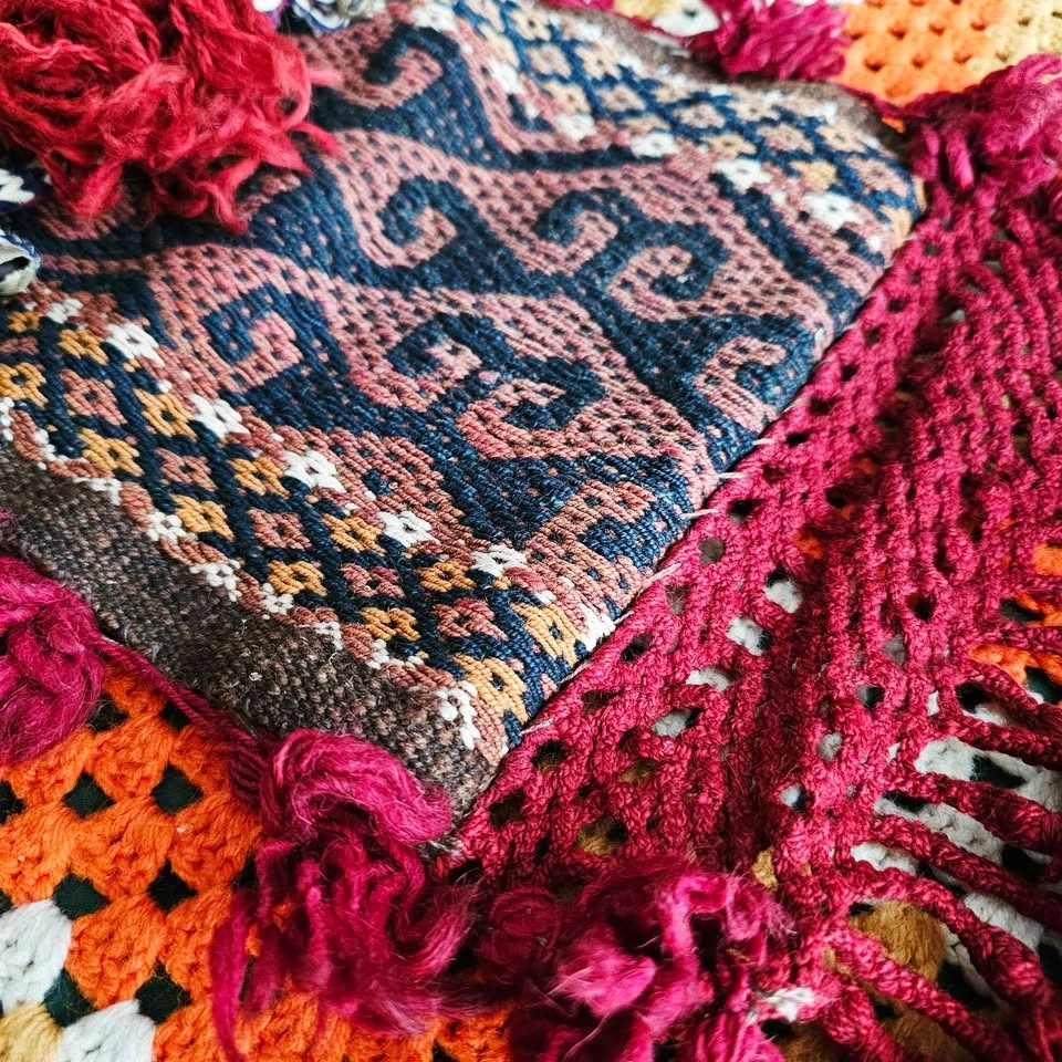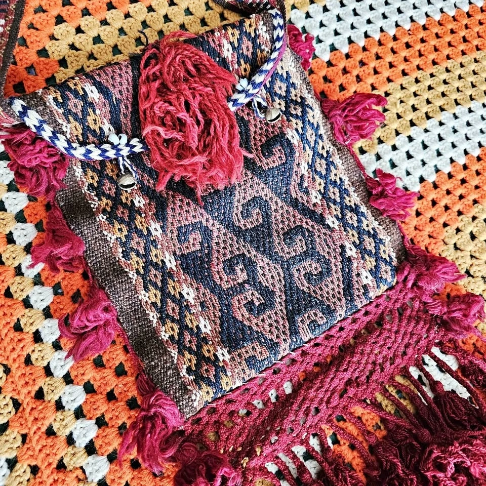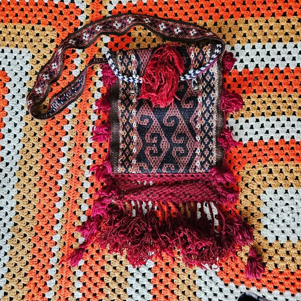 vintage 1960s 1970s folk bag peruvian woven crossbody fringe tapestry purse boho hippie hippy artisan textile festival shoulder bag ethnic folk style South American bohemian tribal
