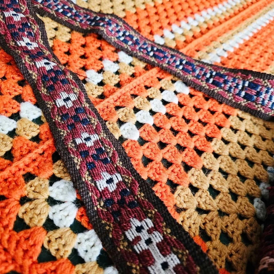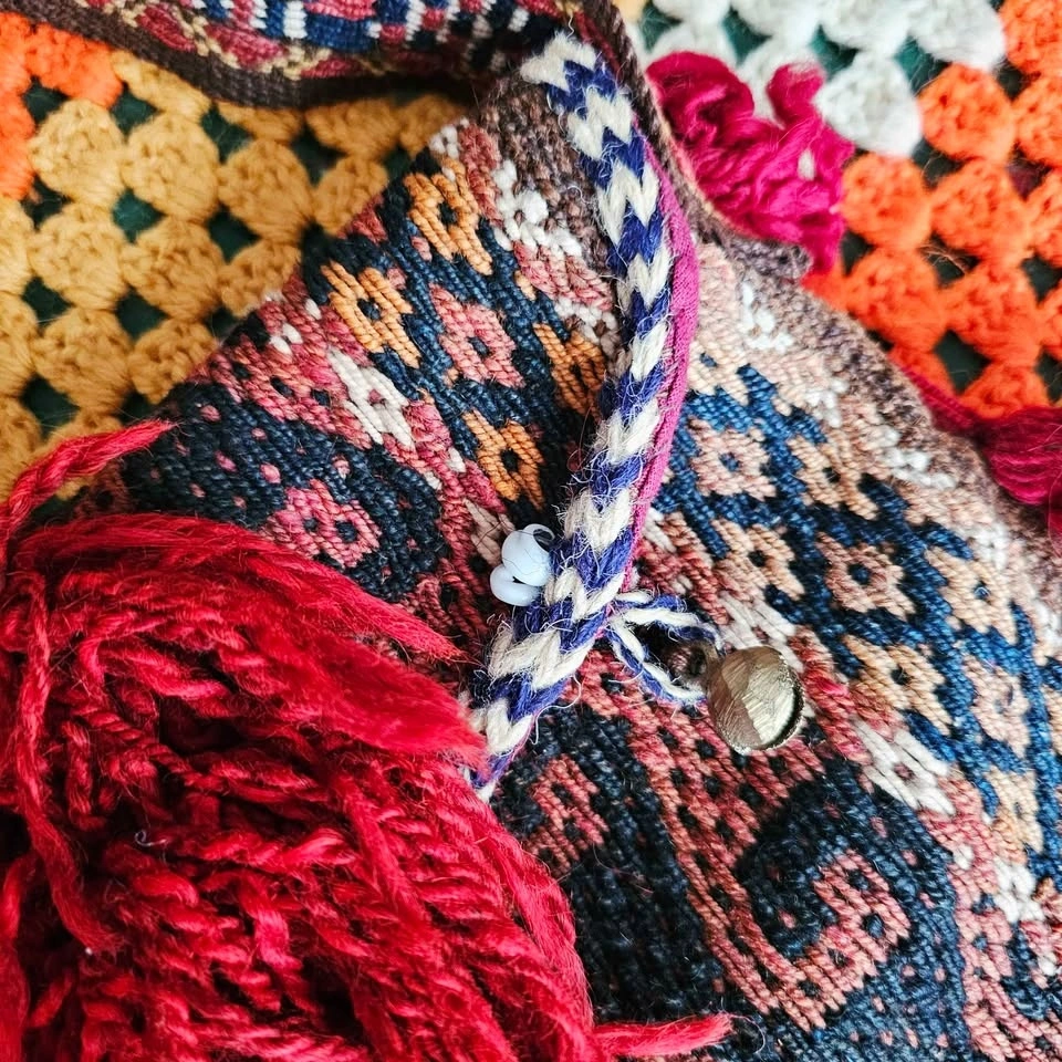 This piece features a woven patterned shoulder strap, and red yarn tassel accents. Bag closes with a soft flap closure that secures on two brass bells which jingle as you move, a classic folk accent from 70s Peruvian bags. Interior is lined in burgundy cotton. Lightweight and easy to wear crossbody or on the shoulder.