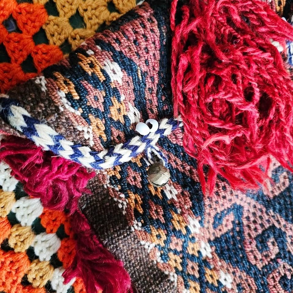This piece features a woven patterned shoulder strap, and red yarn tassel accents. Bag closes with a soft flap closure that secures on two brass bells which jingle as you move, a classic folk accent from 70s Peruvian bags. Interior is lined in burgundy cotton. Lightweight and easy to wear crossbody or on the shoulder.