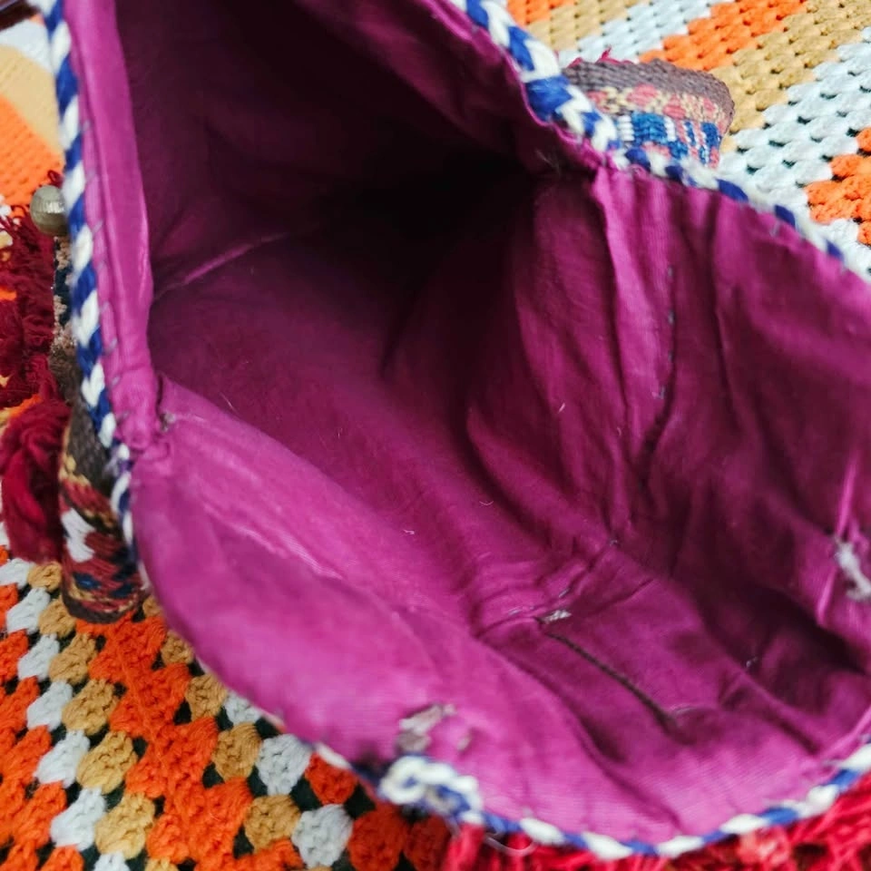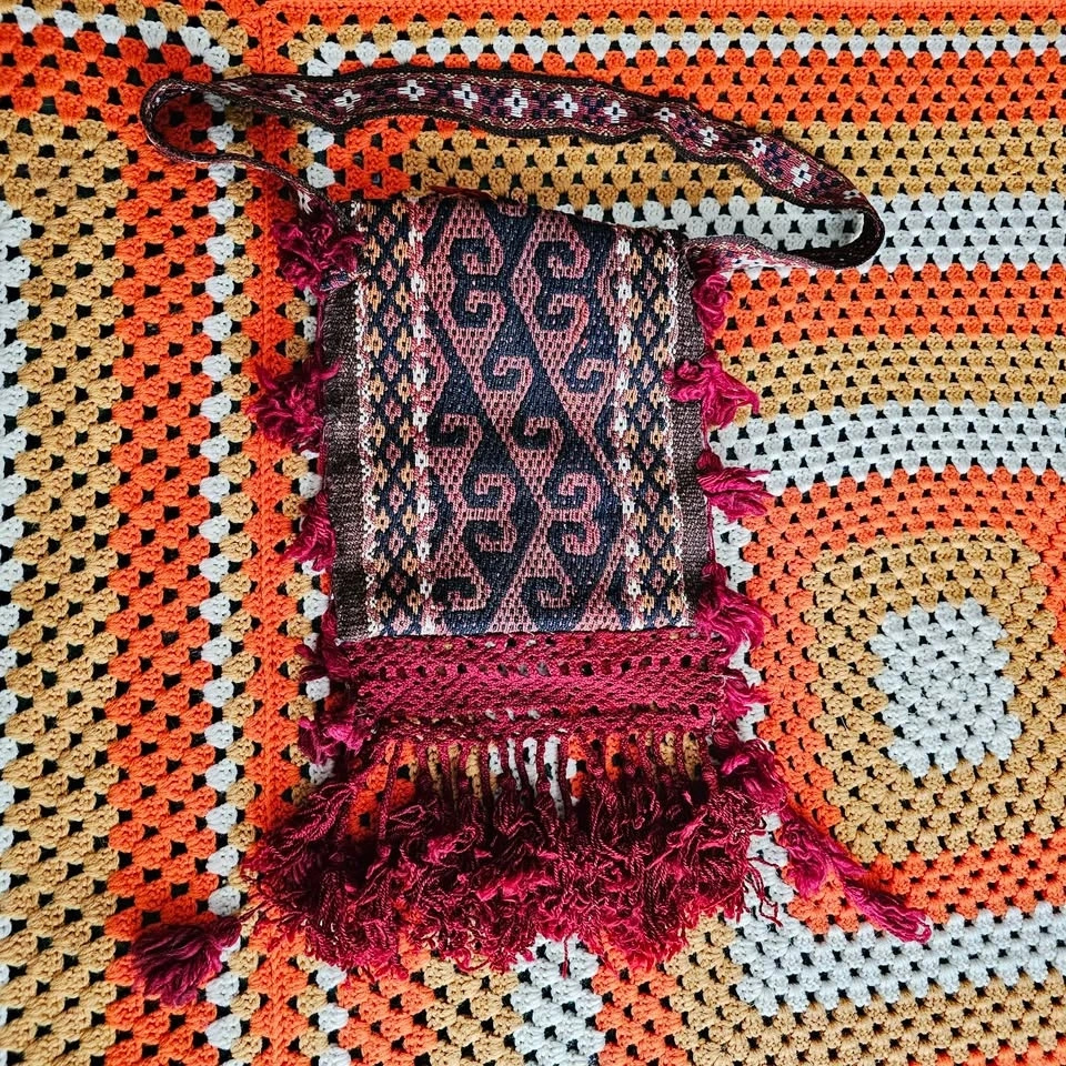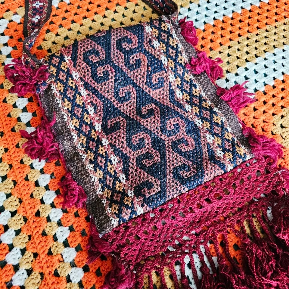 vintage 1960s 1970s folk bag peruvian woven crossbody fringe tapestry purse boho hippie hippy artisan textile festival shoulder bag ethnic folk style South American bohemian tribal