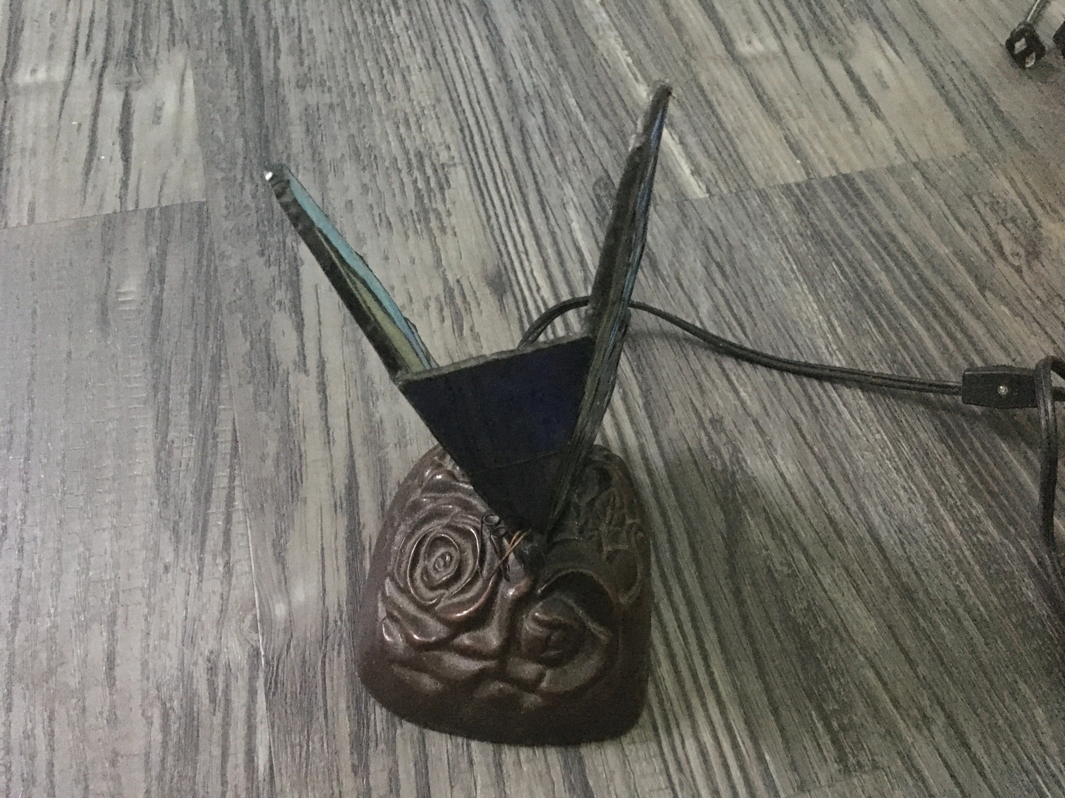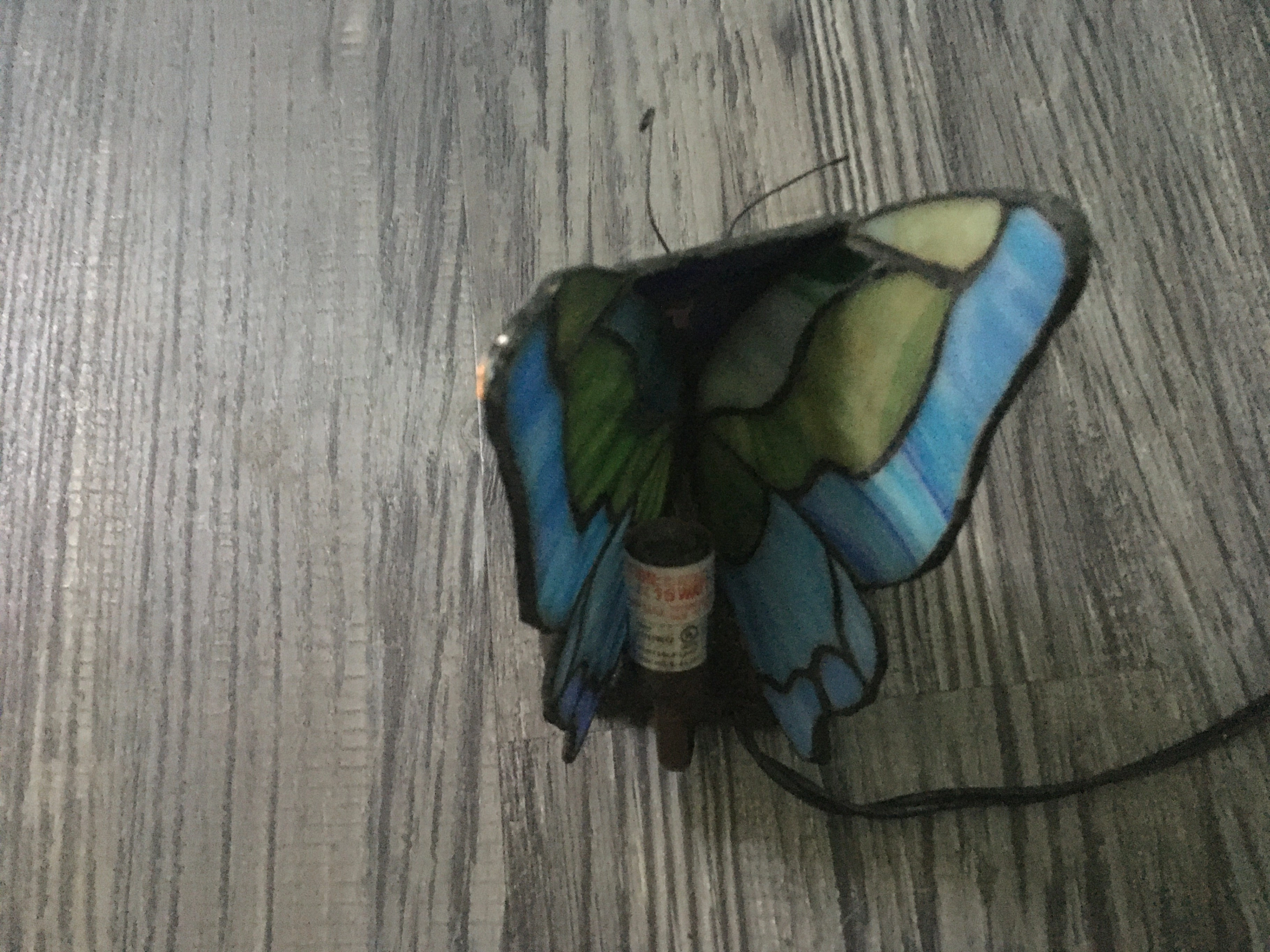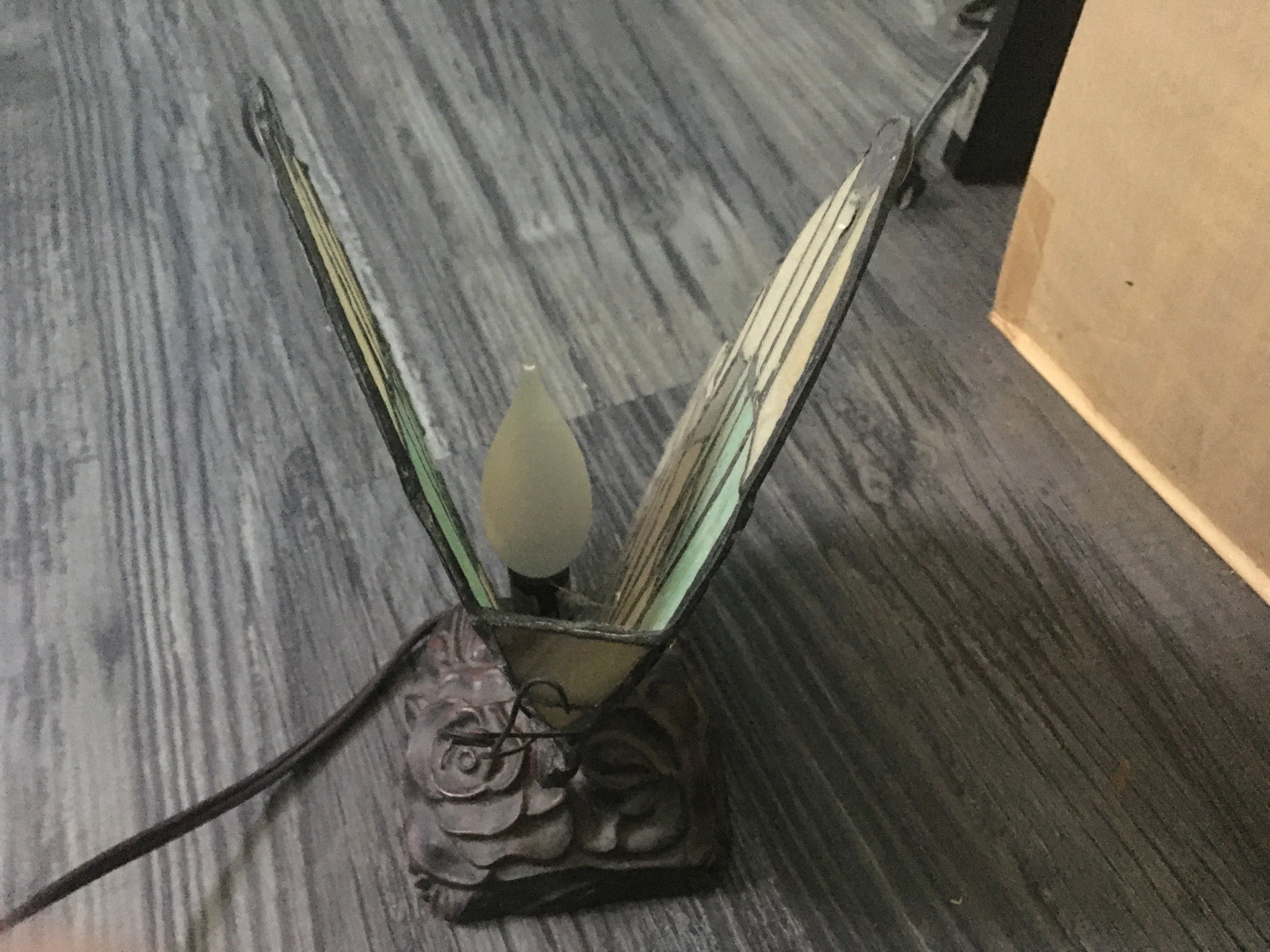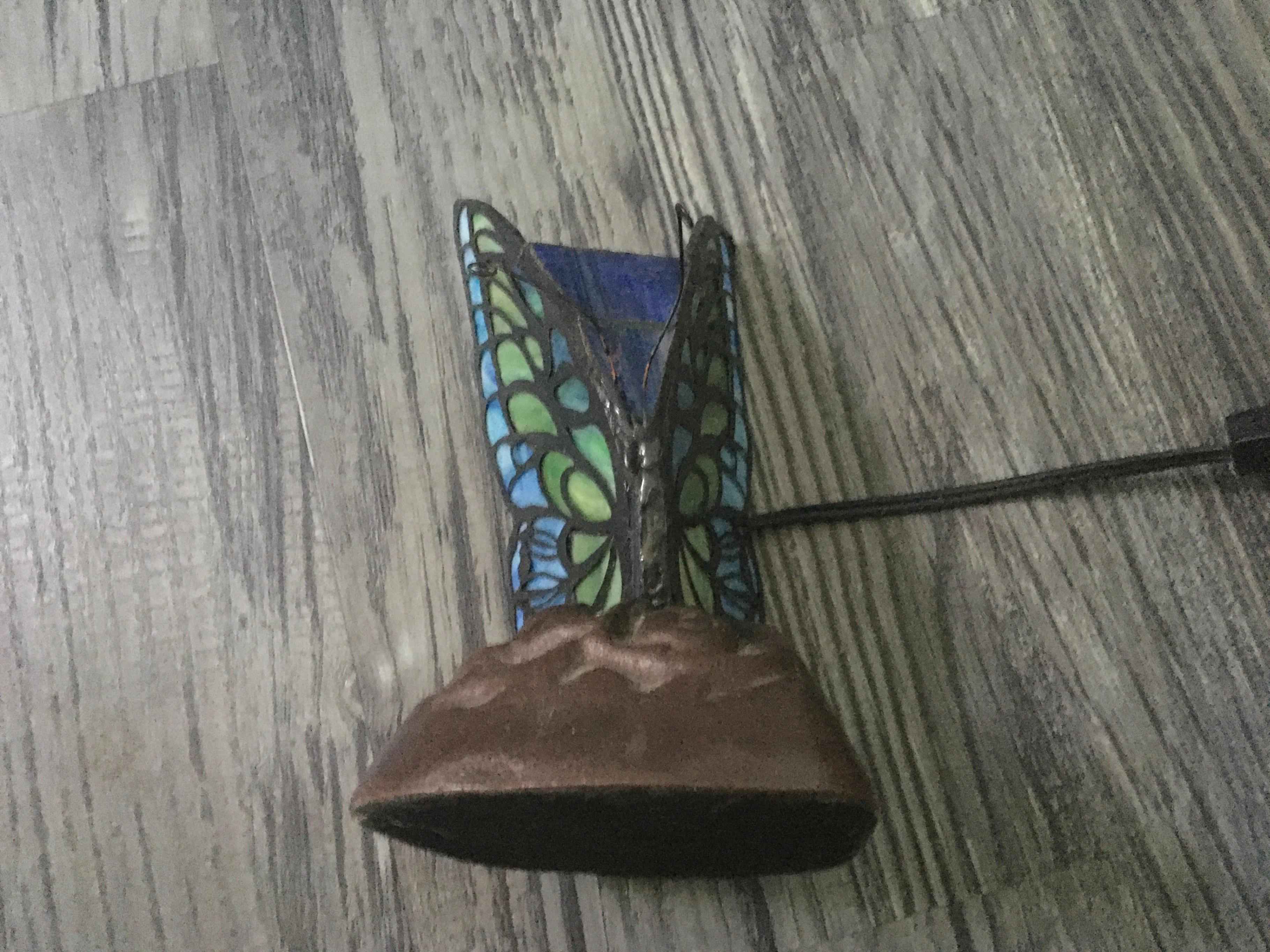 Selling a cute butterfly-shaped accent lamp! It features stained glass wings in shades of green, yellow, and brown. The base has a floral design. This little lamp would add a touch of whimsy to any room