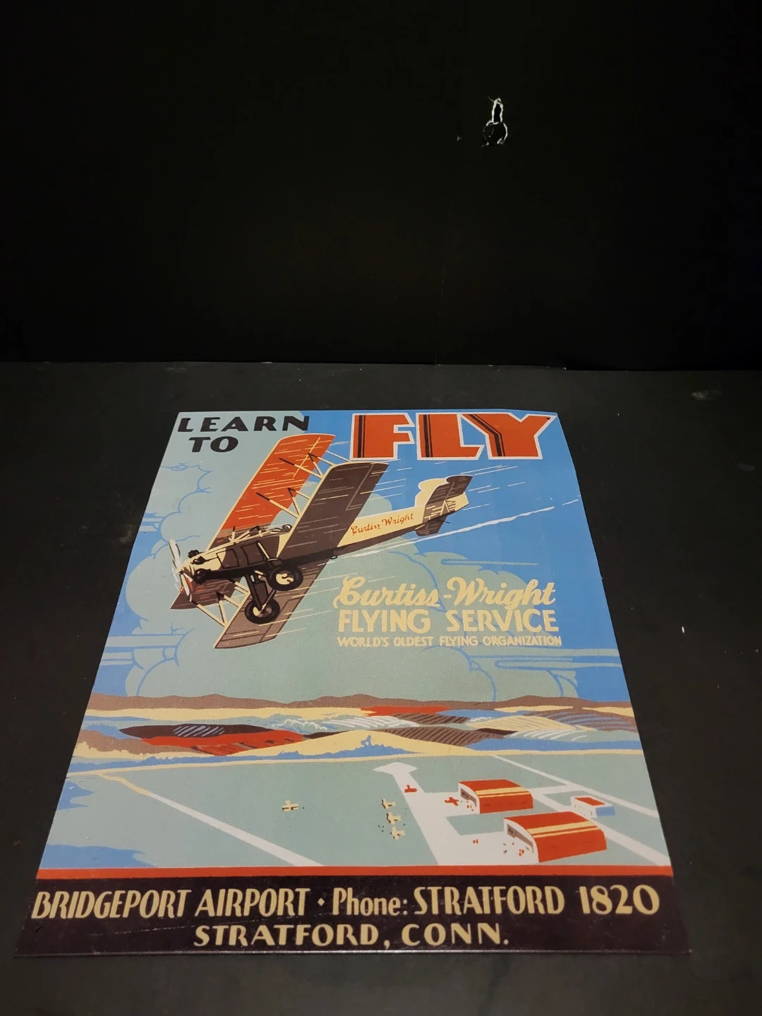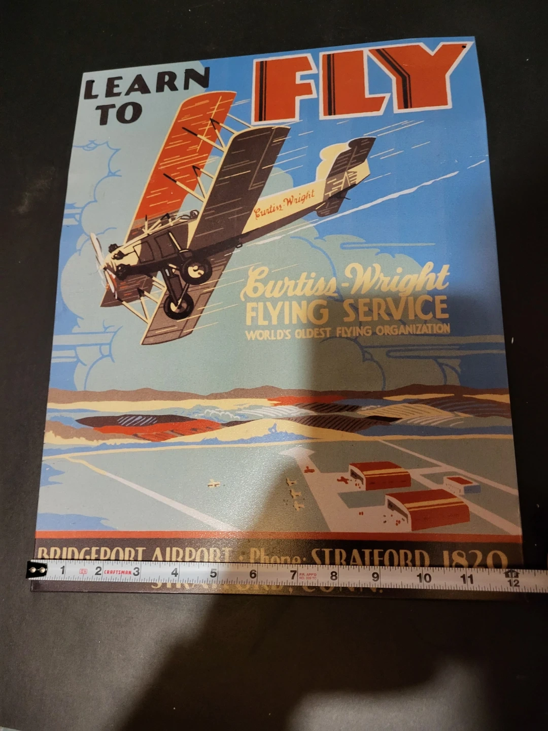 Selling a Curtiss Wright Flying Service metal sign! It features a vintage airplane design with the words "Learn to Fly" at the top. The sign also showcases Bridgeport Airport and the phone number for Stratford 1820. The dimensions are approximately 12 inches by 16 inches.
