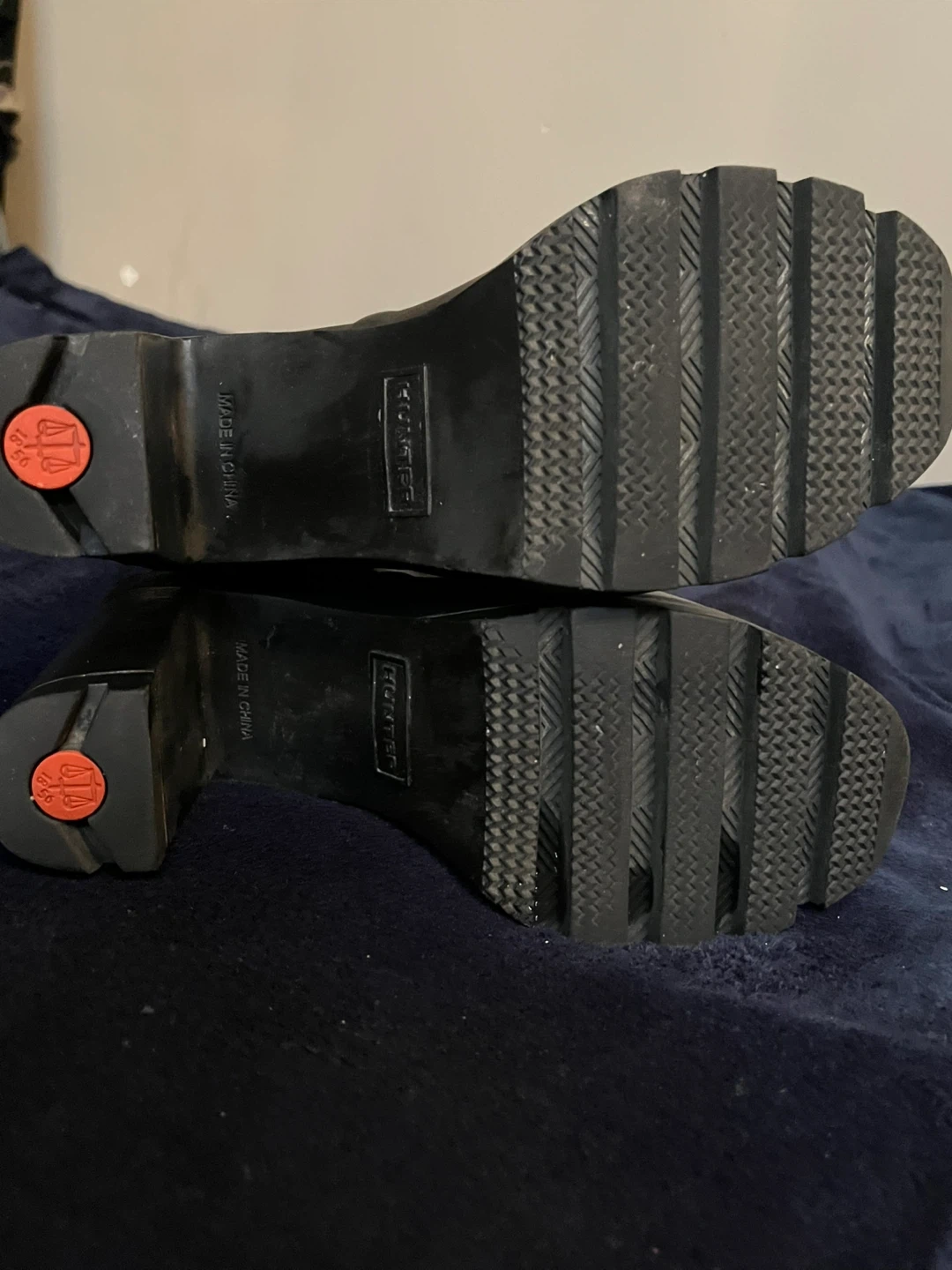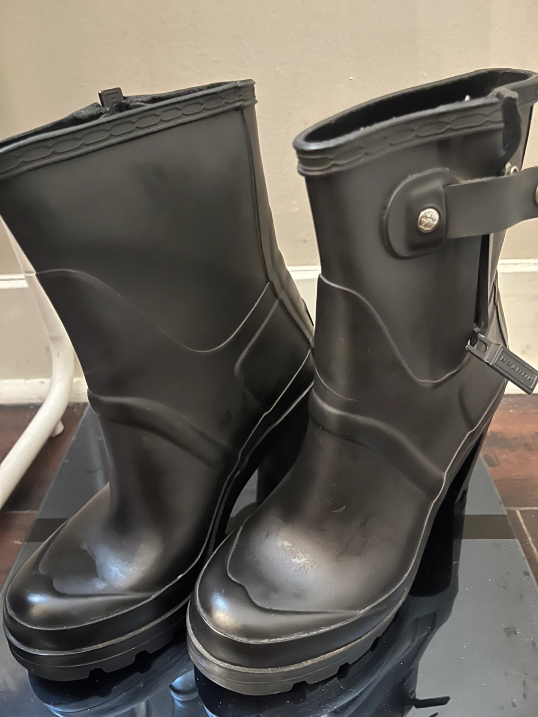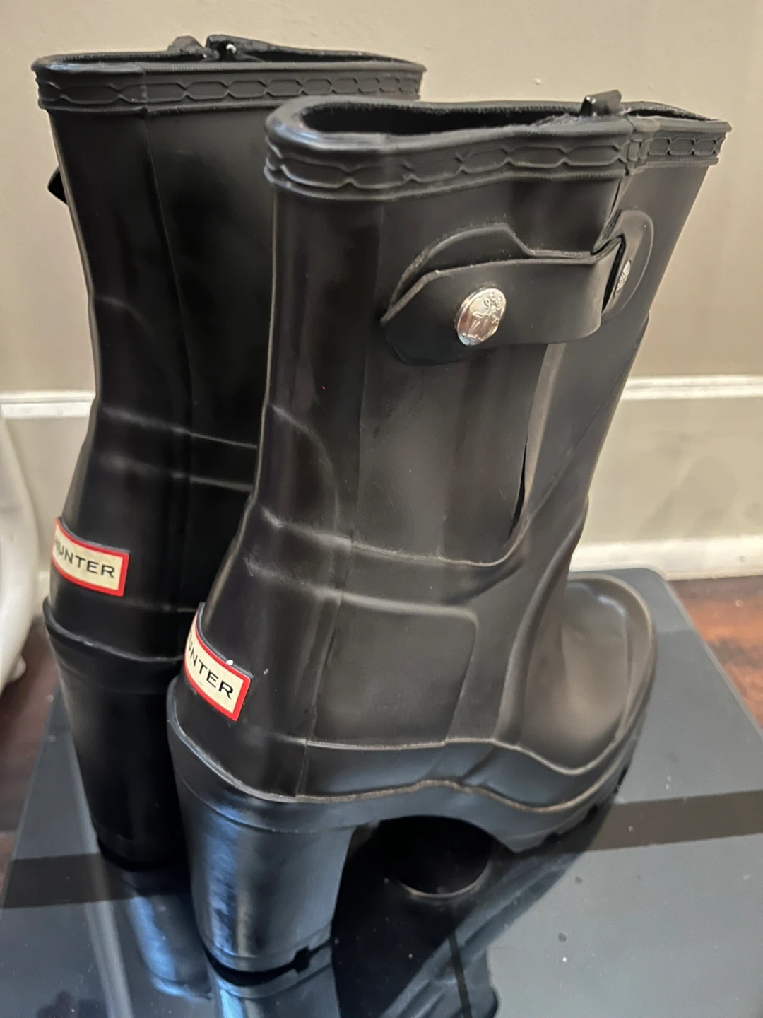 Hunter black rubber heeled chunky boots, bought in NY a couple of years ago.