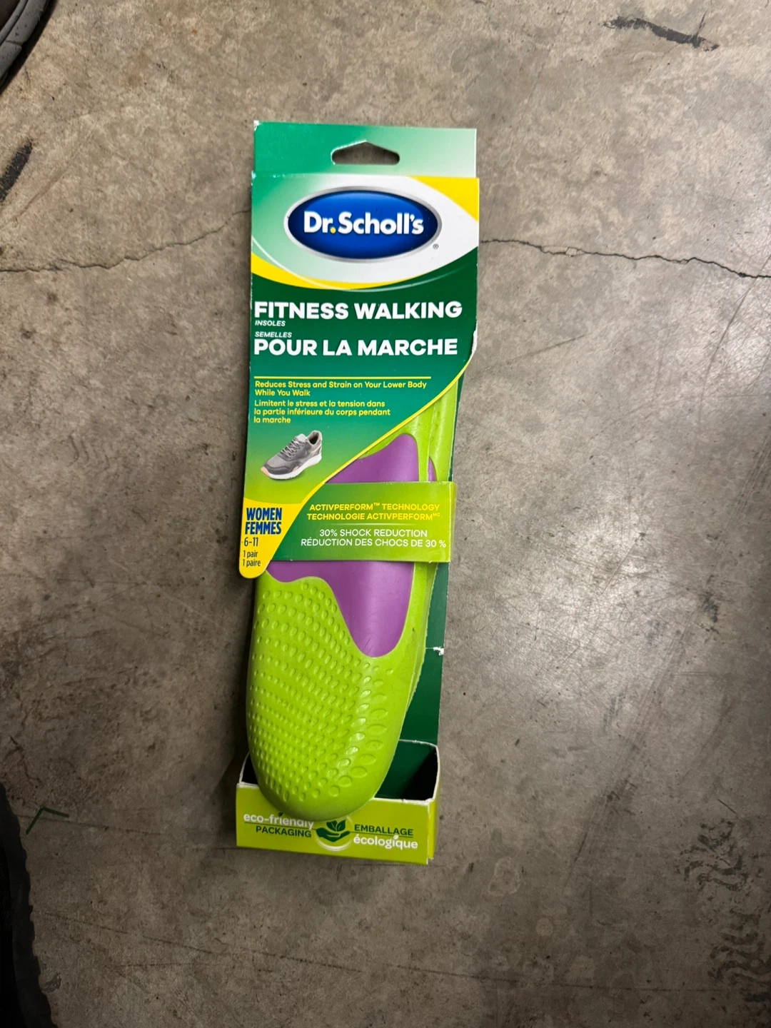 Dr. Scholl's Fitness Walking insoles for women's sizes 6-11 are designed to reduce stress and strain on your lower body while you walk. They feature ActivPerform technology for 30% shock reduction. Eco-friendly packaging