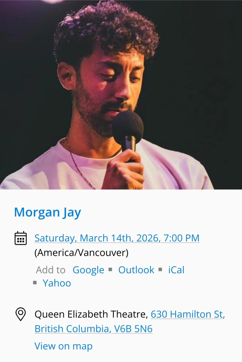 Selling ONE ticket to see Morgan Jay at the Queen Elizabeth Theatre.