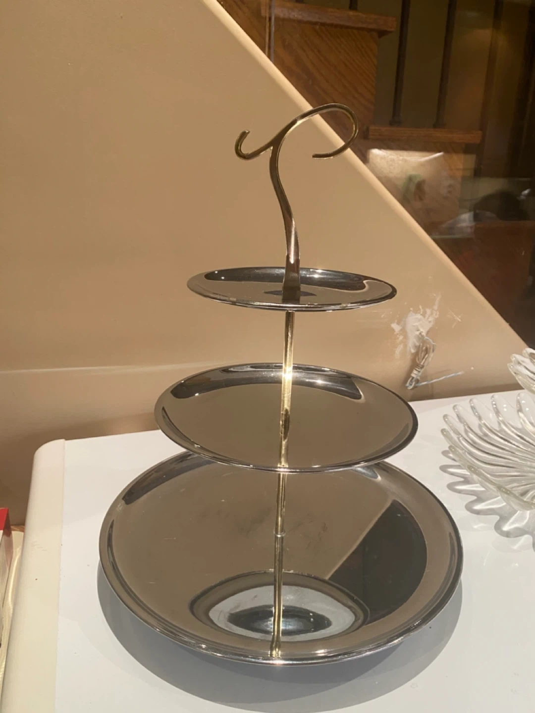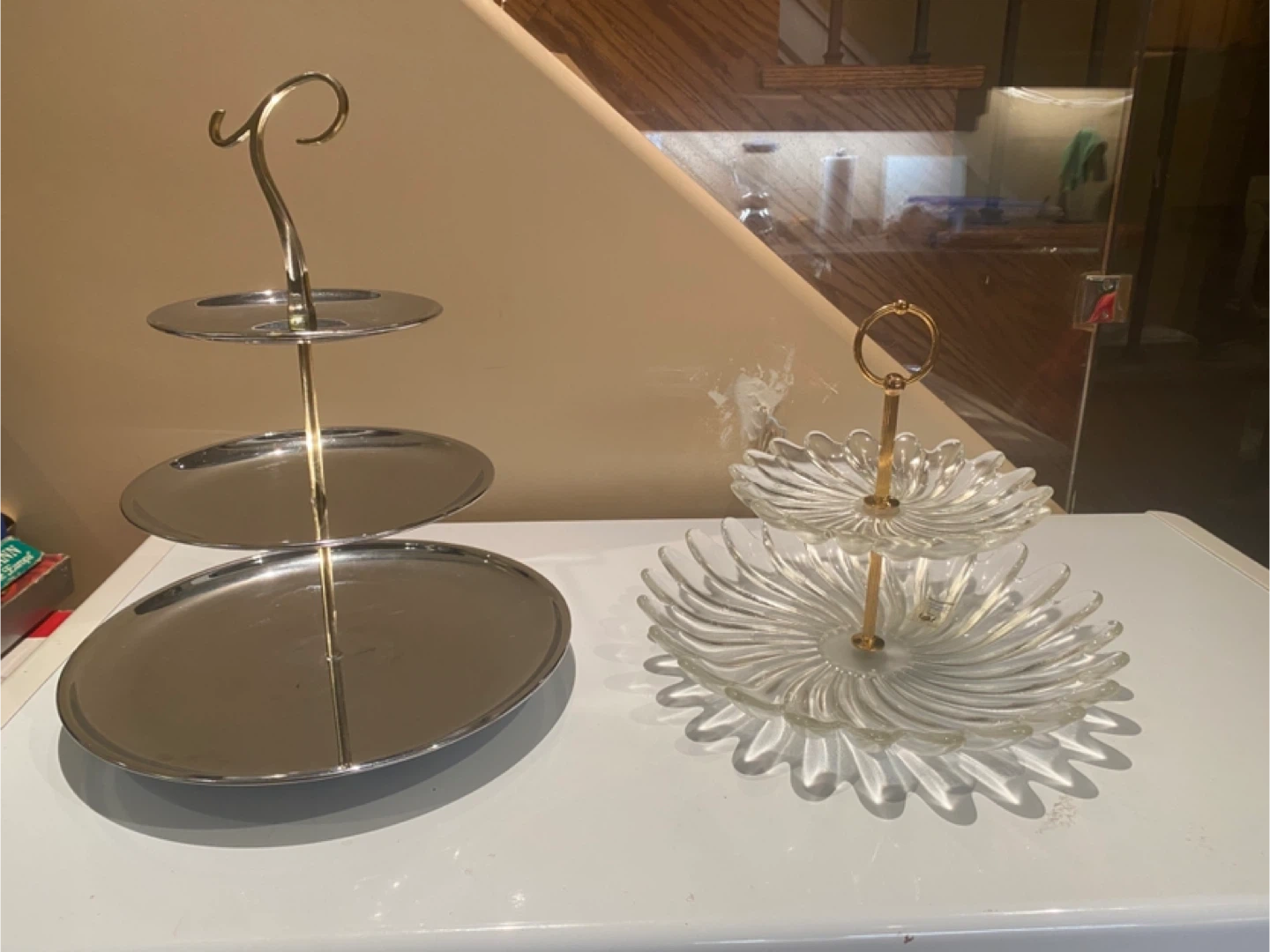 Selling a couple of tiered serving stands. One is stainless steel and the other is crystal