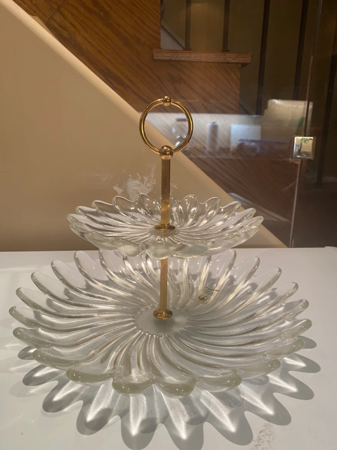 Selling a couple of tiered serving stands. One is stainless steel and the other is crystal