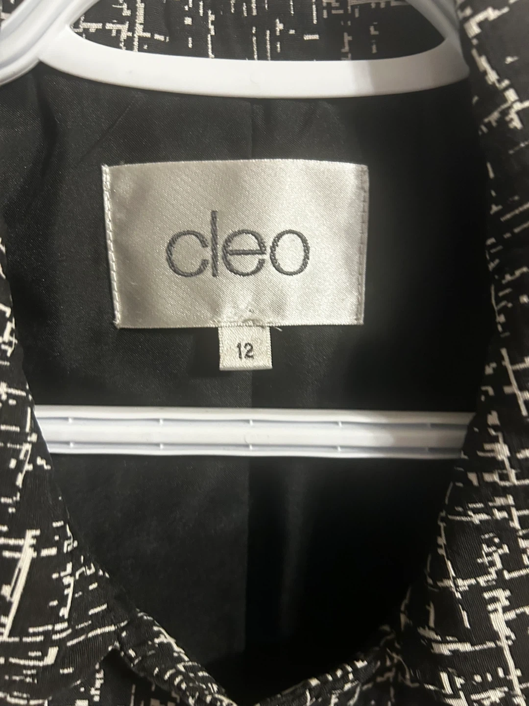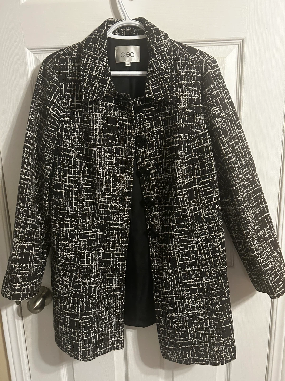 Selling a Cleo spring jacket black and white pattern. It's a size 12 and made in Canada! The material is 52% polyester and 48% rayon/rayonne. It's in great condition and ready for a new owner