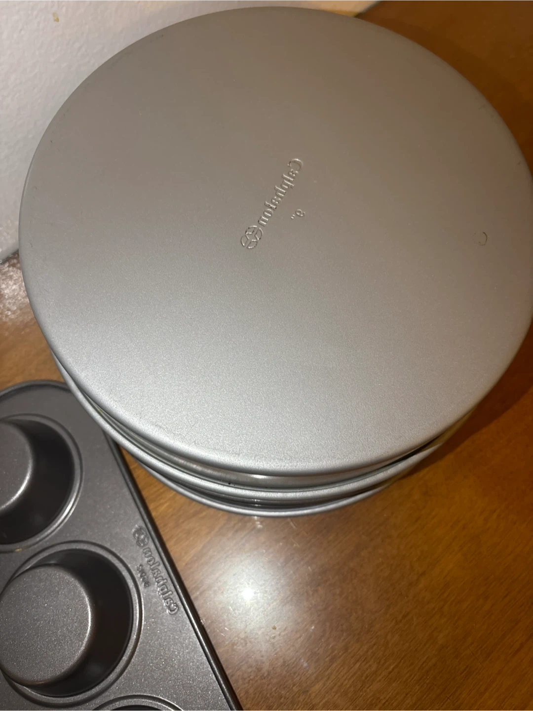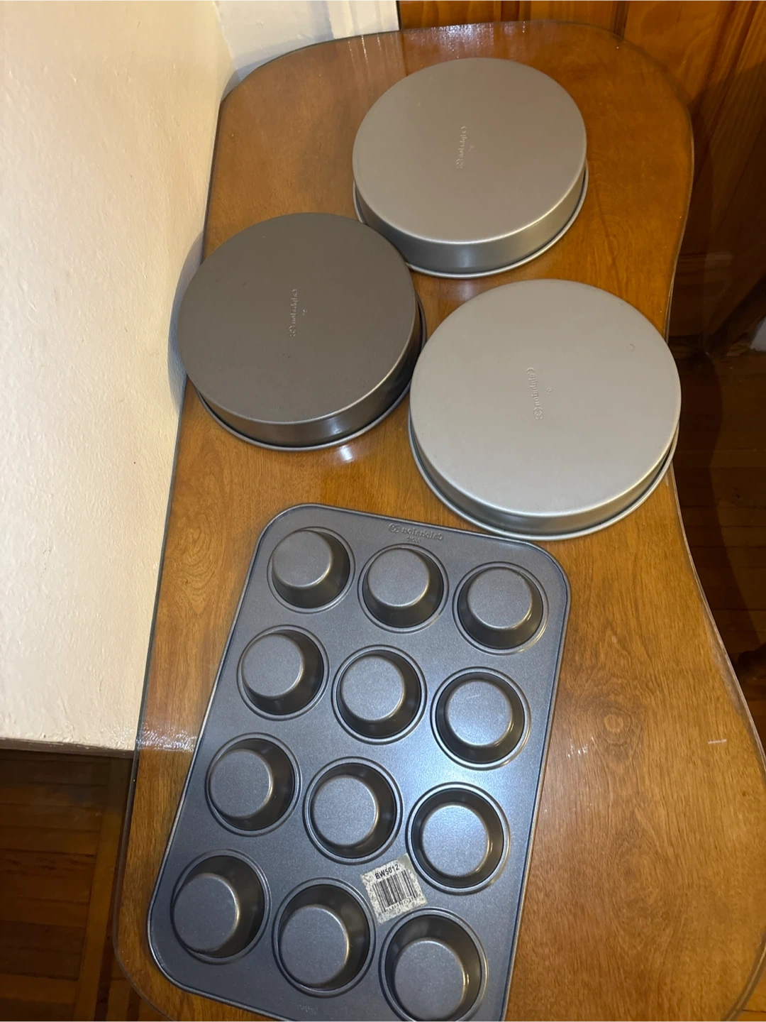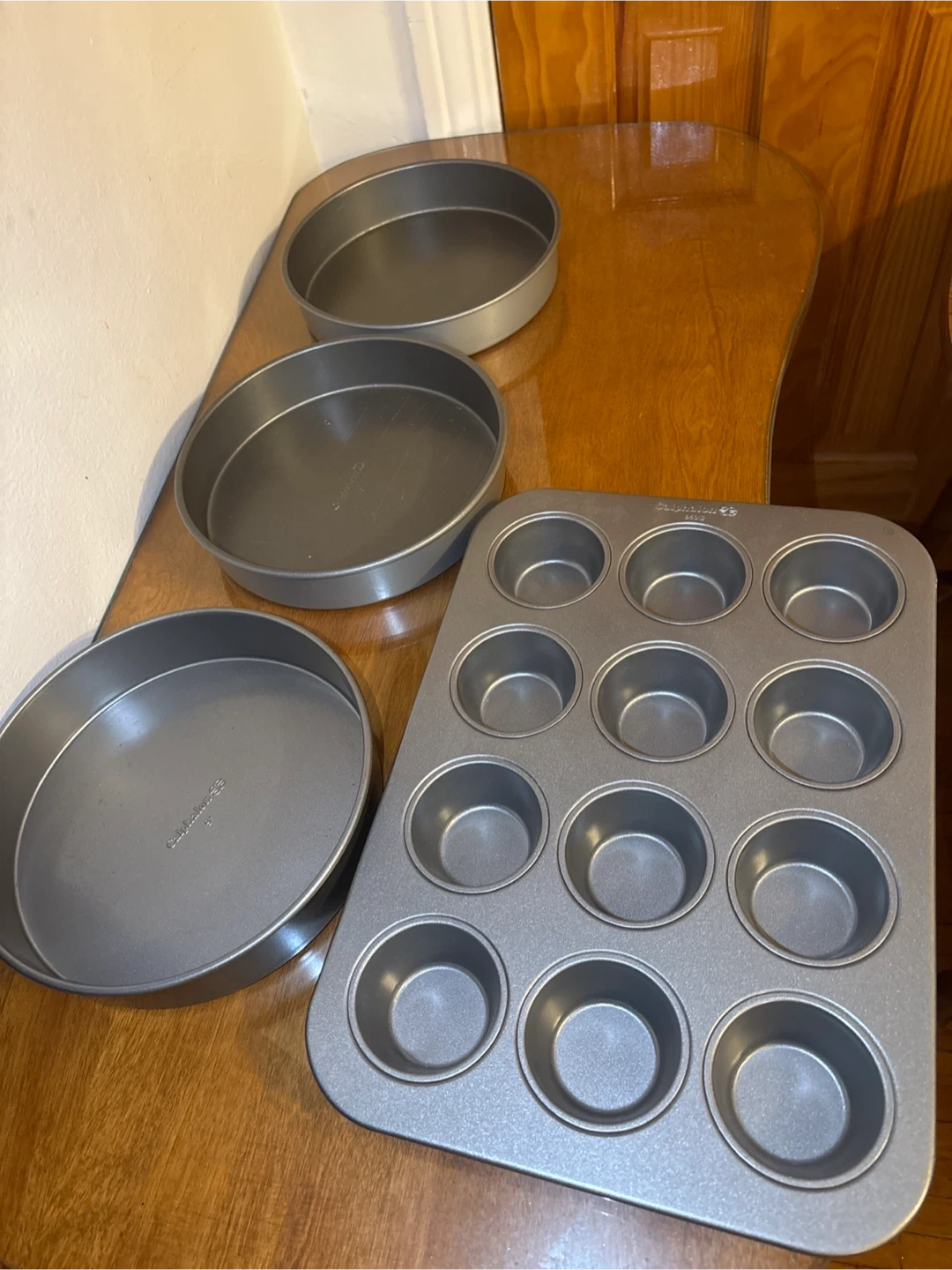 Selling a set of Calphalon baking pans! Included are three 9-inch round cake pans and one muffin tin. They're in good used condition and ready for your next baking project