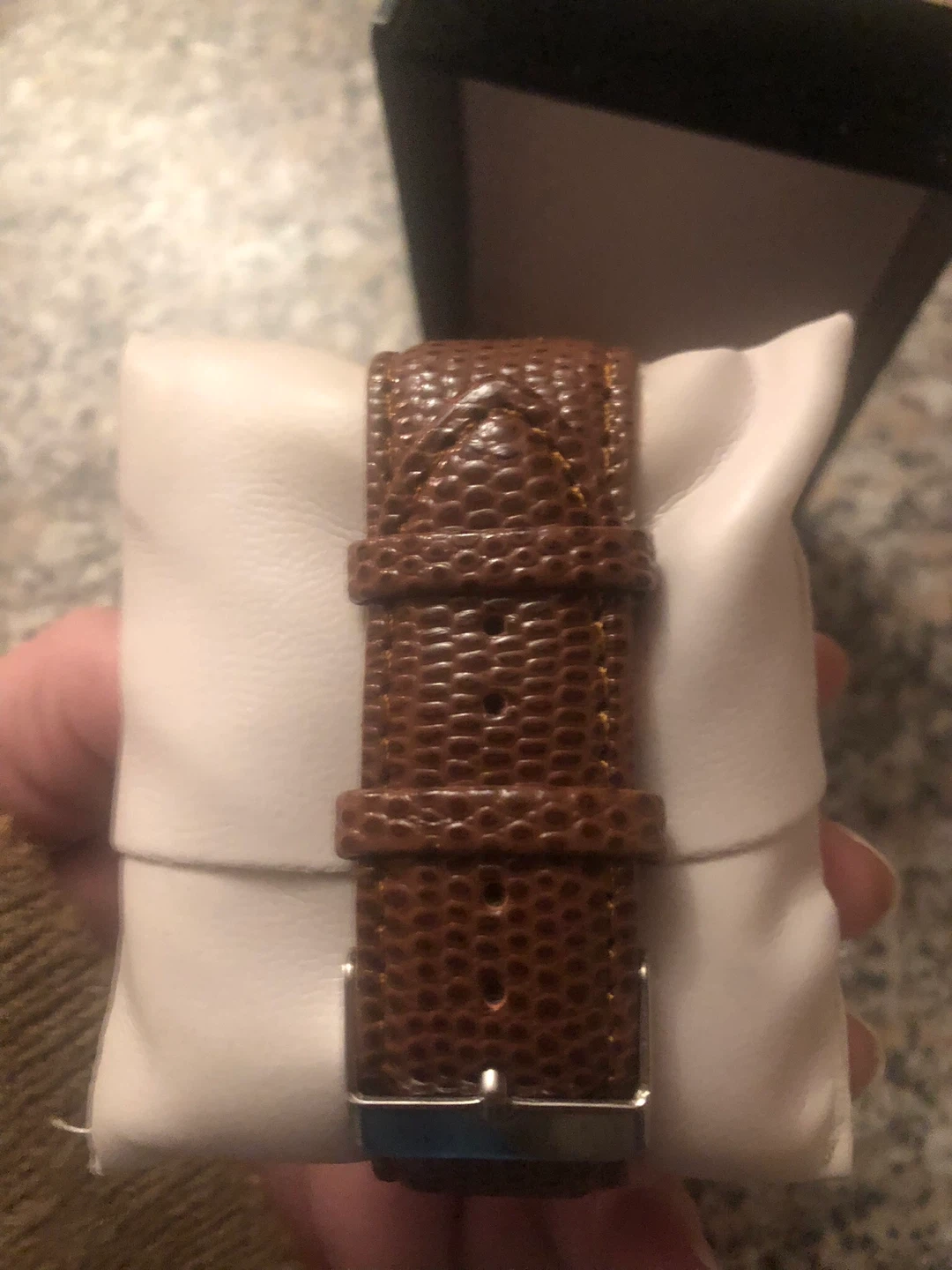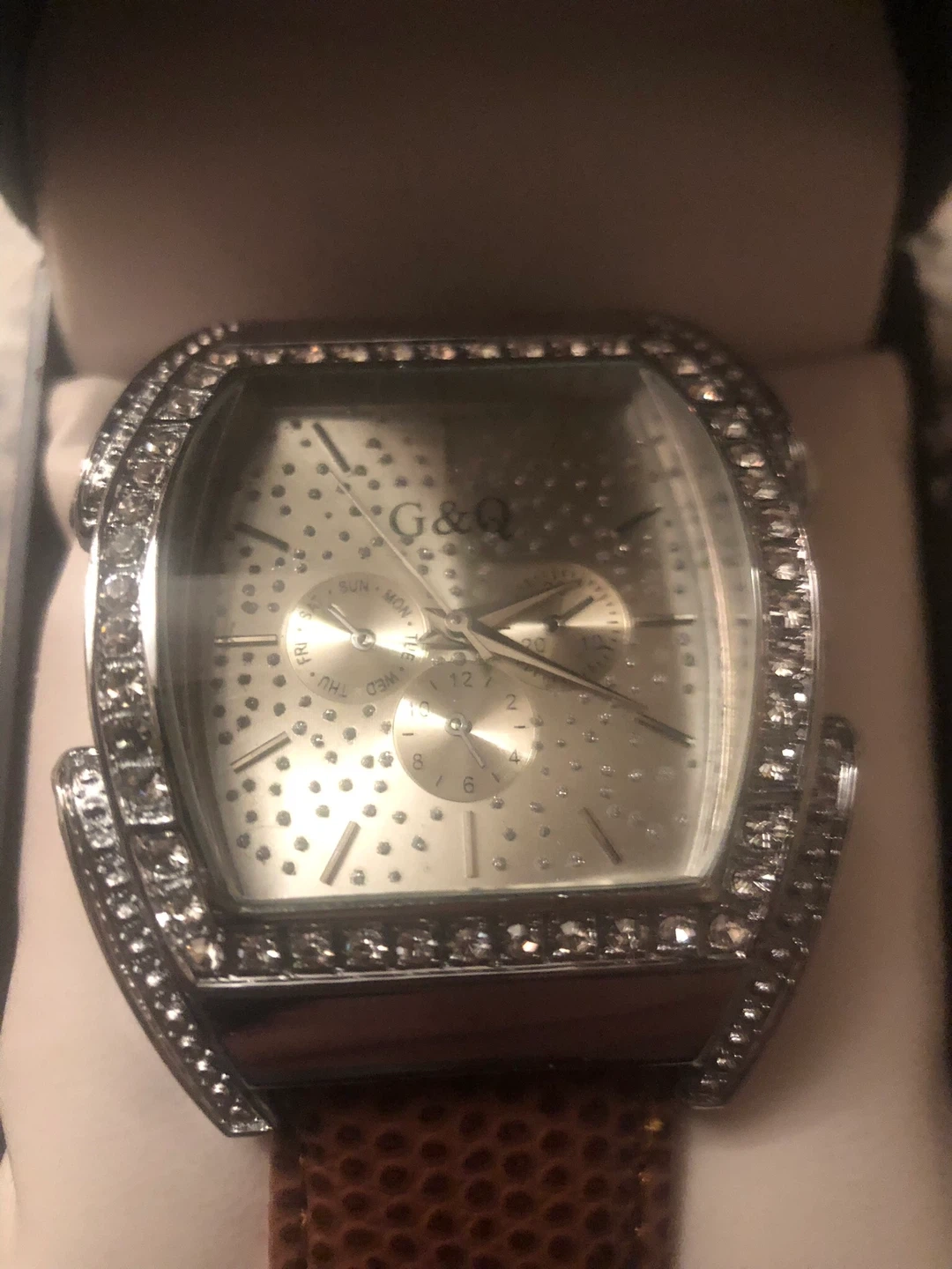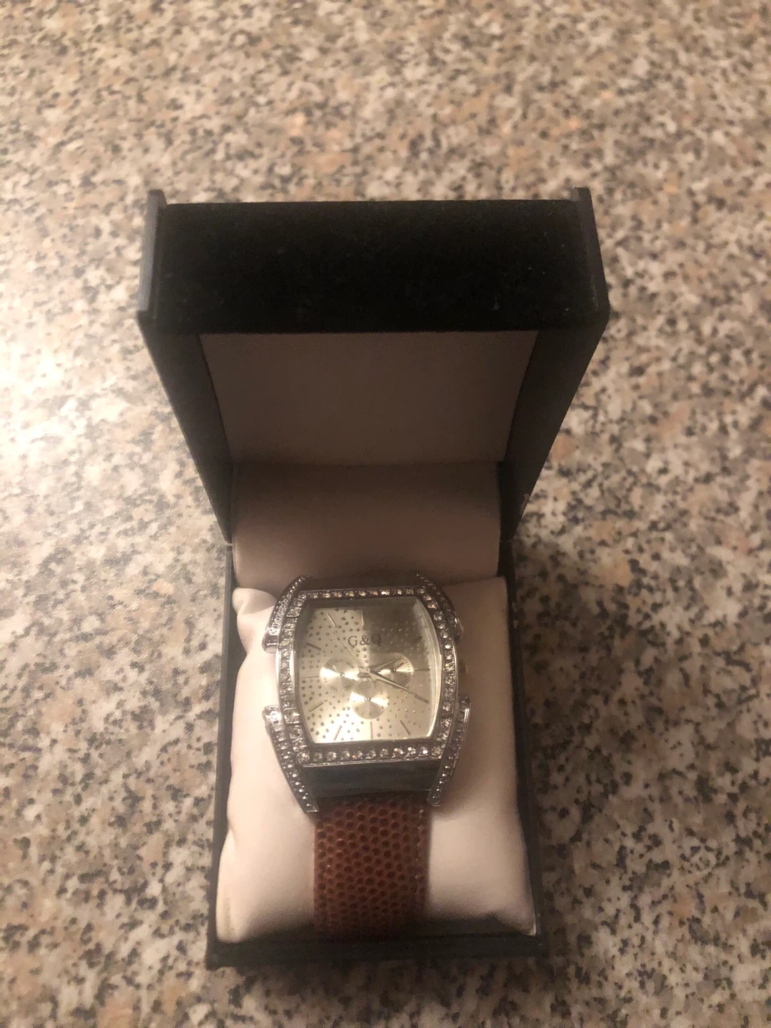 Selling a G&Q watch. It features a silver face and a brown leather-like band. The watch comes with its original box, making it a great find!