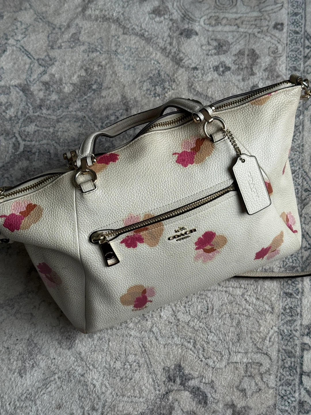 This is a Coach bag, handcrafted from the finest materials. It has superior craftsmanship and attention to detail that reflect the commitment to enduring quality. It is white with a floral pattern and has a pink interior.
