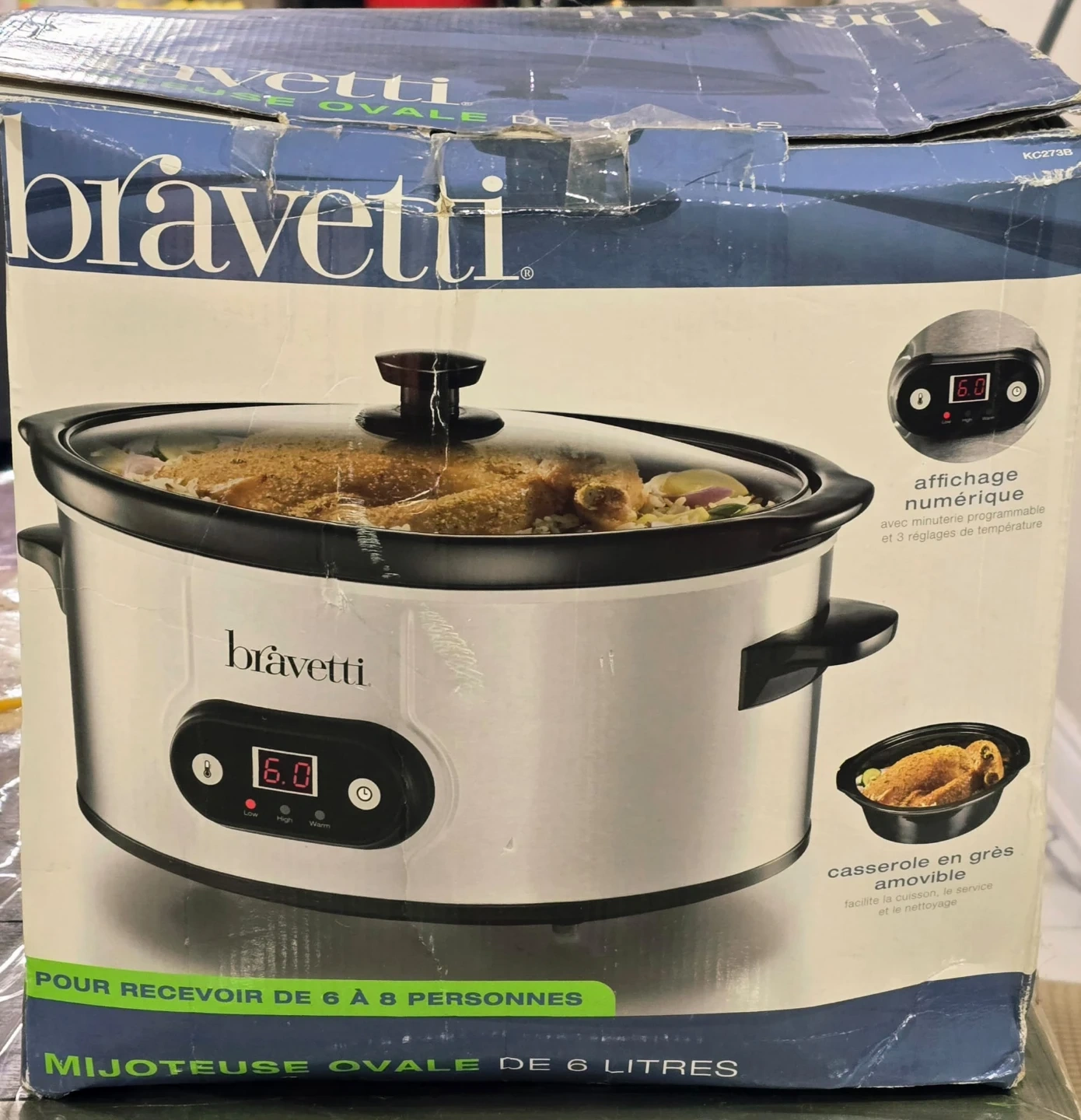 Selling a Bravetti oval slow cooker with a 6-litre capacity! It's perfect for cooking meals for 6 to 8 people. It features a digital display with a programmable timer and 3 temperature settings. The stoneware casserole is removable for easy serving and cleaning