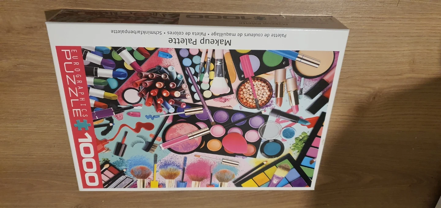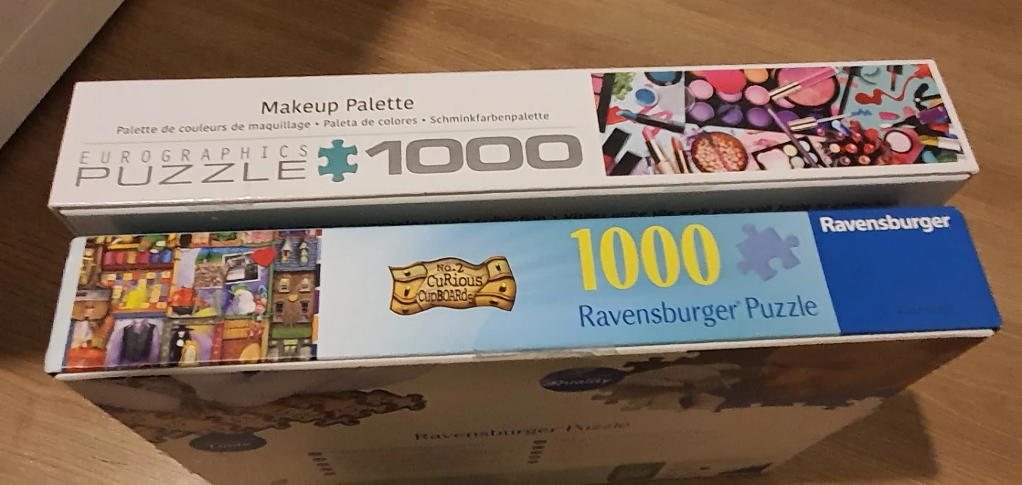 One is a Ravensburger 1000-piece puzzle, "No. 2 Curious Cupboard". The other is a Eurographics 1000-piece puzzle, "Makeup Palette". Both are in great condition and ready for a new home!