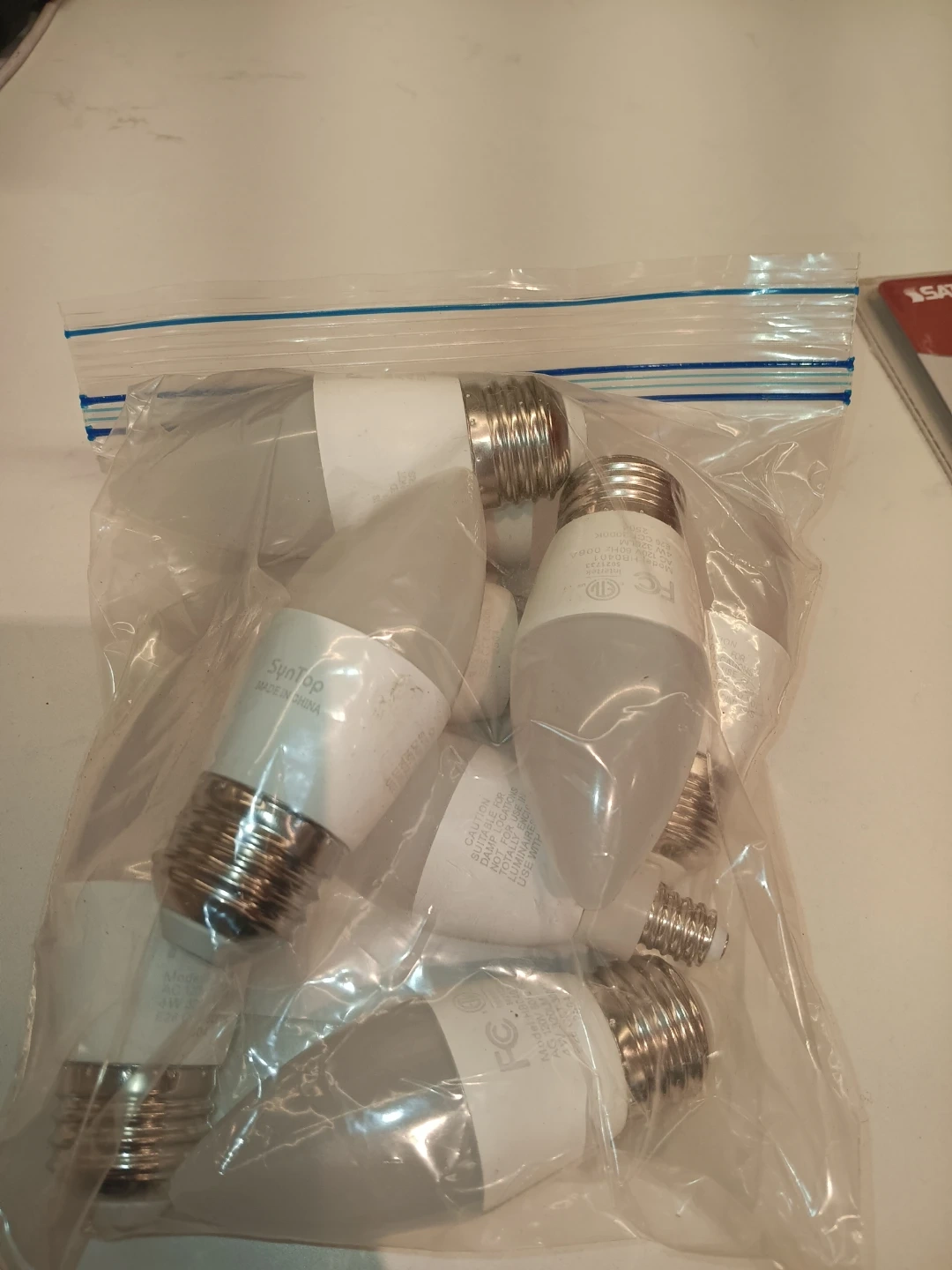 Selling a bag of SynTop LED light bulbs! They are suitable for damp locations and are not for use in luminaires that are totally enclosed. Model: AG. Input: 120V. Output: 4W. Color temperature: 3000K